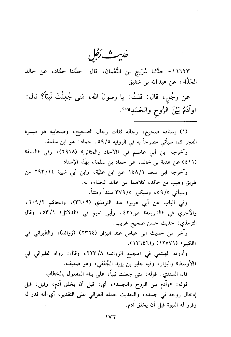 ١٦٦٢٣ - حَدَّثَنَا سُرَيْجُ بْنُ النُّعْمَانِ، قَالَ: حَدَّثَنَا حَمَّادٌ، عَنْ خَالِدٍ الْحَذَّاءِ، عَنْ عَبْدِ اللهِ بْنِ شَقِيقٍ، عَنْ رَجُلٍ قَالَ: قُلْتُ: يَا رَسُولَ اللهِ، مَتَى جُعِلْتَ نَبِيًّا؟ قَالَ: " وَآدَمُ بَيْنَ الرُّوحِ وَالْجَسَدِ " (١)