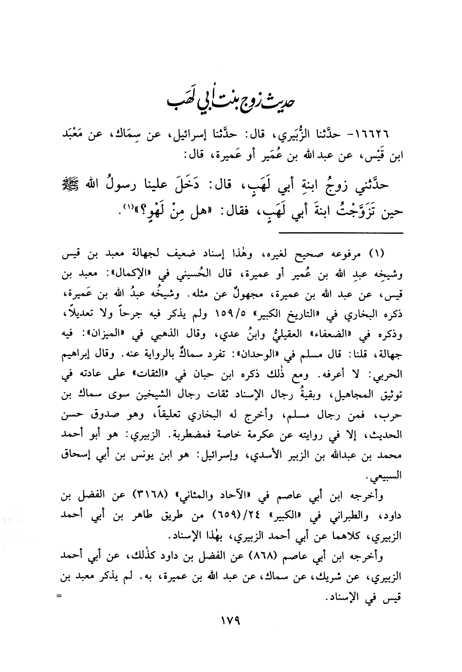 ١٦٦٢٦ - حَدَّثَنَا الزُّبَيْرِيُّ، قَالَ: حَدَّثَنَا إِسْرَائِيلُ، عَنْ سِمَاكٍ، عَنْ مَعْبَدِ بْنِ قَيْسٍ، عَنْ عَبْدِ اللهِ بْنِ عُمَيْرٍ أَوْ عَمِيرَةَ قَالَ: حَدَّثَنِي زَوْجُ ابْنَةِ أَبِي لَهَبٍ قَالَ: " دَخَلَ عَلَيْنَا رَسُولُ اللهِ صَلَّى اللهُ عَلَيْهِ وَسَلَّمَ حِينَ تَزَوَّجْتُ ابْنَةَ أَبِي لَهَبٍ، فَقَالَ: " هَلْ مِنْ لَهْوٍ؟ " (١)
