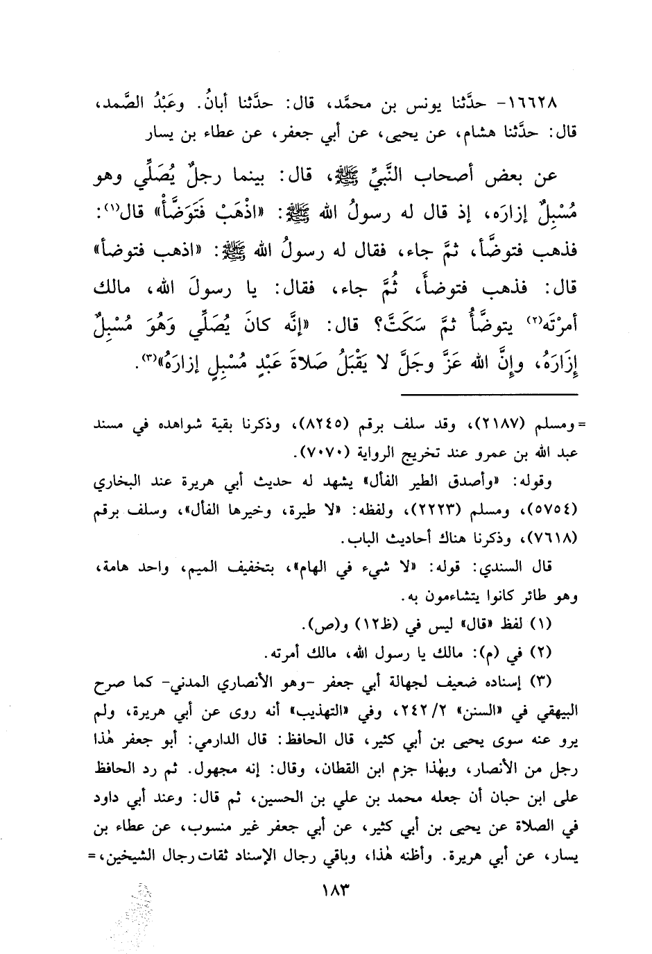 ١٦٦٢٨ - حَدَّثَنَا يُونُسُ بْنُ مُحَمَّدٍ، قَالَ: حَدَّثَنَا أَبَانُ، وَعَبْدُ الصَّمَدِ قَالَ: حَدَّثَنَا هِشَامٌ، عَنْ يَحْيَى، عَنْ أَبِي جَعْفَرٍ، عَنْ عَطَاءِ بْنِ يَسَارٍ، عَنْ بَعْضِ أَصْحَابِ النَّبِيِّ صَلَّى اللهُ عَلَيْهِ وَسَلَّمَ قَالَ: بَيْنَمَا رَجُلٌ يُصَلِّي وَهُوَ مُسْبِلٌ إِزَارَهُ إِذْ قَالَ لَهُ رَسُولُ اللهِ صَلَّى اللهُ عَلَيْهِ وَسَلَّمَ: " اذْهَبْ فَتَوَضَّأْ "، قَالَ (١) : فَذَهَبَ فَتَوَضَّأَ، ثُمَّ جَاءَ، فَقَالَ لَهُ رَسُولُ اللهِ صَلَّى اللهُ عَلَيْهِ وَسَلَّمَ: " اذْهَبْ فَتَوَضَّأْ "، قَالَ: فَذَهَبَ فَتَوَضَّأَ، ثُمَّ جَاءَ فَقَالَ: يَا رَسُولَ اللهِ؟ مَا لَكَ أَمَرْتَهُ (٢) يَتَوَضَّأُ؟ ثُمَّ سَكَتَّ قَالَ: " إِنَّهُ كَانَ يُصَلِّي وَهُوَ مُسْبِلٌ إِزَارَهُ وَإِنَّ اللهَ عَزَّ وَجَلَّ لَا يَقْبَلُ صَلَاةَ عَبْدٍ مُسْبِلٍ إِزَارَهُ " (٣)