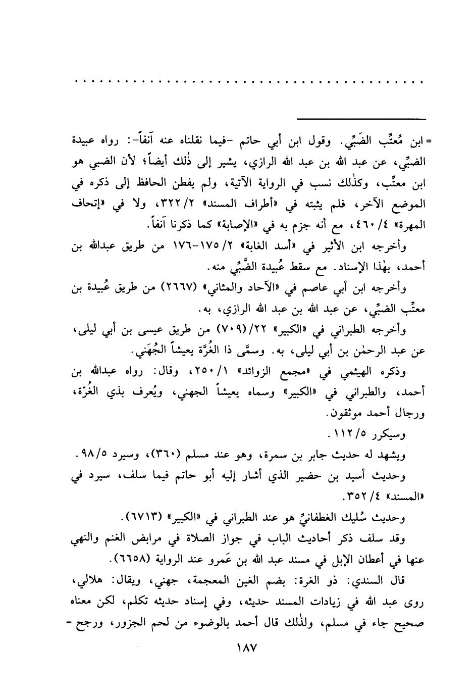 = ابن مُعتب الضِّبي. وقول ابن أبي حاتم- فيما نقلناه عنه آنفاً-: رواه عبيدة الضبي، عن عبد الله بن عبد الله الرازي، يشير إلى ذلك أيضاً لأن الضبي هو ابن معتب، وكذلك نسب في الرواية الآتية، ولم يفطن الحافظ إلى ذكره في الموضع الآخر، فلم يثبته في "أطراف المسند" ٢/٣٢٢، ولا في "إتحاف المهرة" ٤/٤٦٠، مع أنه جزم به في "الإصابة" كما ذكرنا آنفاً.