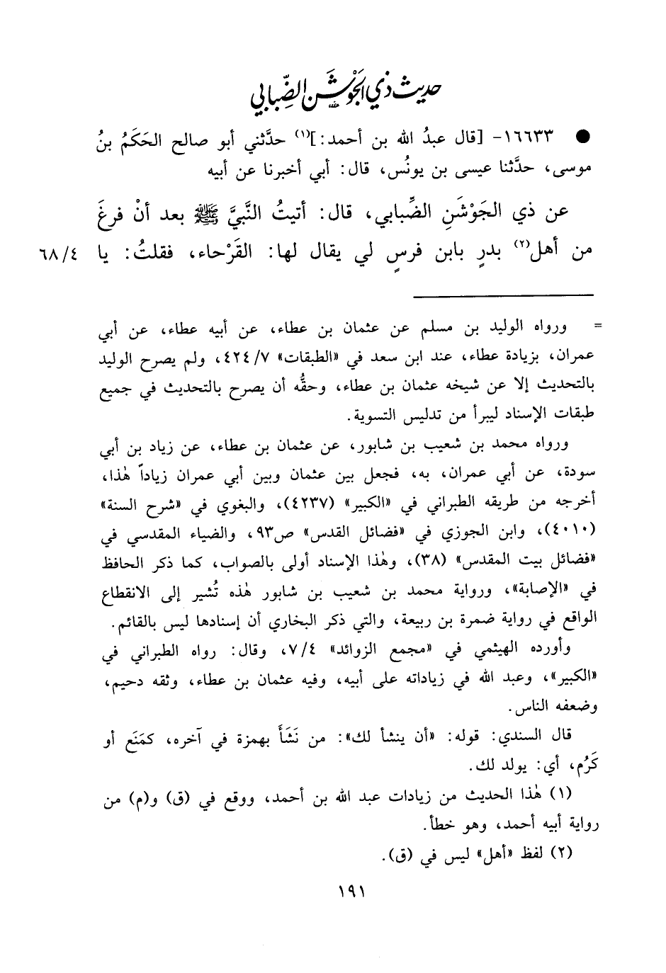 • ١٦٦٣٣ - قَالَ عَبْدُ اللهِ بْنُ أَحْمَدَ (١) ، حَدَّثَنِي أَبُو صَالِحٍ الْحَكَمُ بْنُ مُوسَى، حَدَّثَنَا عِيسَى بْنُ يُونُسَ، قَالَ: أَبِي أَخْبَرَنَا، عَنْ أَبِيهِ، عَنْ ذِي الْجَوْشَنِ الضِّبَابِيِّ قَالَ: أَتَيْتُ النَّبِيَّ صَلَّى اللهُ عَلَيْهِ وَسَلَّمَ بَعْدَ أَنْ فَرَغَ مِنْ أَهْلِ (٢) بَدْرٍ بِابْنِ فَرَسٍ لِي يُقَالُ لَهَا: الْقَرْحَاءُ، فَقُلْتُ: يَا