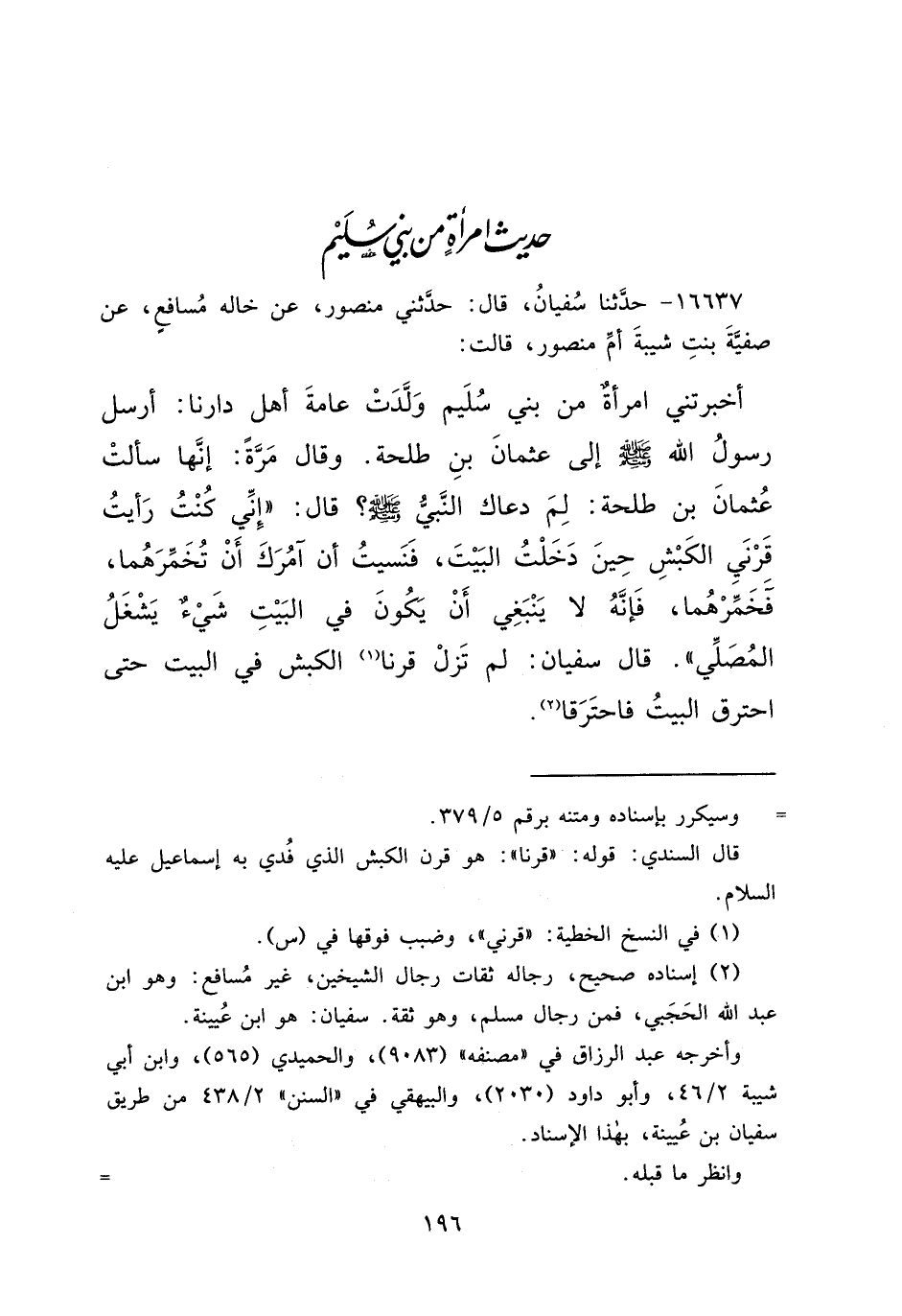 ١٦٦٣٧ - حَدَّثَنَا سُفْيَانُ، قَالَ: حَدَّثَنِي مَنْصُورٌ، عَنْ خَالِهِ مُسَافِعٍ، عَنْ صَفِيَّةَ بِنْتِ شَيْبَةَ أُمِّ مَنْصُورٍ قَالَتْ: أَخْبَرَتْنِي امْرَأَةٌ مِنْ بَنِي سُلَيْمٍ وَلَدَتْ عَامَّةَ أَهْلِ دَارِنَا، أَرْسَلَ رَسُولُ اللهِ صَلَّى اللهُ عَلَيْهِ وَسَلَّمَ إِلَى عُثْمَانَ بْنِ طَلْحَةَ ـ وَقَالَ مَرَّةً: إِنَّهَا سَأَلَتْ عُثْمَانَ بْنَ طَلْحَةَ ـ لِمَ دَعَاكَ النَّبِيُّ صَلَّى اللهُ عَلَيْهِ وَسَلَّمَ؟ قَالَ: " إِنِّي كُنْتُ رَأَيْتُ قَرْنَيِ الْكَبْشِ حِينَ دَخَلْتُ الْبَيْتَ، فَنَسِيتُ أَنْ آمُرَكَ أَنْ تُخَمِّرَهُمَا، فَخَمِّرْهُمَا فَإِنَّهُ لَا يَنْبَغِي أَنْ يَكُونَ فِي الْبَيْتِ شَيْءٌ يَشْغَلُ الْمُصَلِّيَ "، قَالَ سُفْيَانُ: لَمْ تَزَلْ قَرْنَا (١) الْكَبْشِ فِي الْبَيْتِ حَتَّى احْتَرَقَ الْبَيْتُ فَاحْتَرَقَا (٢)