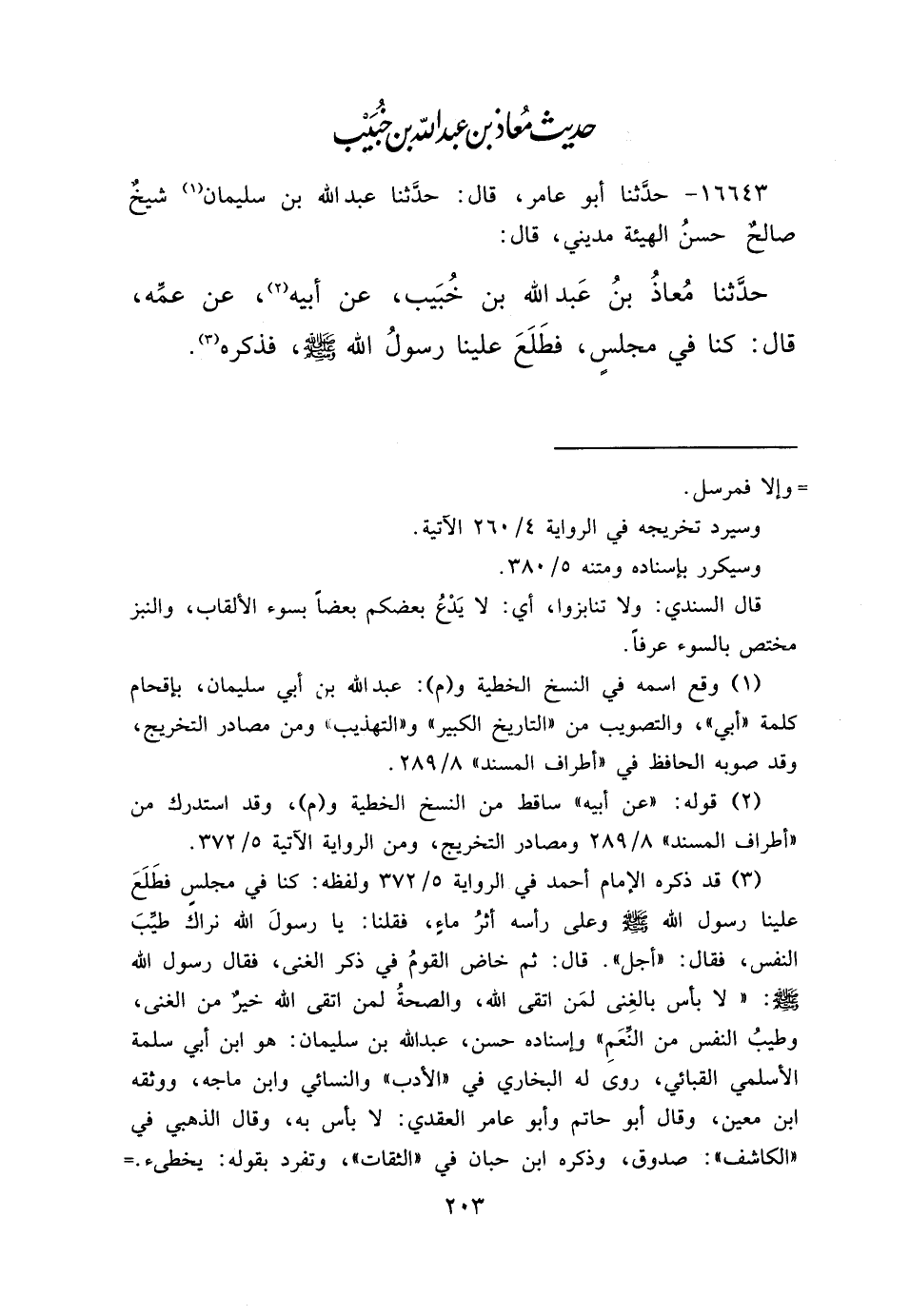 (٣) قد ذكره الإمام أحمد في الرواية ٥/٣٧٢ ولفظه: كنا في مجلسِ فطَلَعَ علينا رسول الله صَلَّى اللهُ عَلَيْهِ وَسَلَّمَ وعلى رأسه أثرُ ماءِ، فقلنا: يا رسولَ الله نراك طيبَ النفس، فقال: "أجل". قال: ثم خاض القومُ في ذكر الغنى، فقال رسول الله صَلَّى اللهُ عَلَيْهِ وَسَلَّمَ: " لا بأس بالغِنى لمَن اتقى الله، والصحةُ لمن اتقى الله خيرٌ من الغنى، وطيبُ النفس من النعَمِ" وإسناده حسن، عبد الله بن سليمان: هو ابن أبي سلمة الأسلمي القبائي، روى له البخاري في "الأدب" والنسائي وابن ماجه، ووثقه ابن معين، وقال أبو حاتم وأبو عامر العقدي: لا بأس به، وقال الذهبي في "الكاشف": صدوق، وذكره ابن حبان في "الثقات"، وتفرد بقوله: يخطئ.=