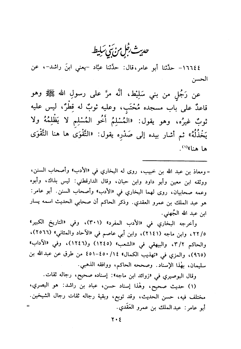 ١٦٦٤٤ - حَدَّثَنَا أَبُو عَامِرٍ، قَالَ: حَدَّثَنَا عَبَّادٌ يَعْنِي ابْنَ رَاشِدٍ، عَنِ الْحَسَنِ، عَنْ رَجُلٍ مِنْ بَنِي سَلِيطٍ، أَنَّهُ مَرَّ عَلَى رَسُولِ اللهِ صَلَّى اللهُ عَلَيْهِ وَسَلَّمَ وَهُوَ قَاعِدٌ عَلَى بَابِ مَسْجِدِهِ مُحْتَبٍ وَعَلَيْهِ ثَوْبٌ لَهُ قِطْرٌ، لَيْسَ عَلَيْهِ ثَوْبٌ غَيْرَهُ وَهُوَ يَقُولُ: " الْمُسْلِمُ أَخُو الْمُسْلِمِ، لَا يَظْلِمُهُ وَلَا يَخْذُلُهُ "، ثُمَّ أَشَارَ بِيَدِهِ إِلَى صَدْرِهِ يَقُولُ: " التَّقْوَى هَاهُنَا، التَّقْوَى هَاهُنَا " (١)
