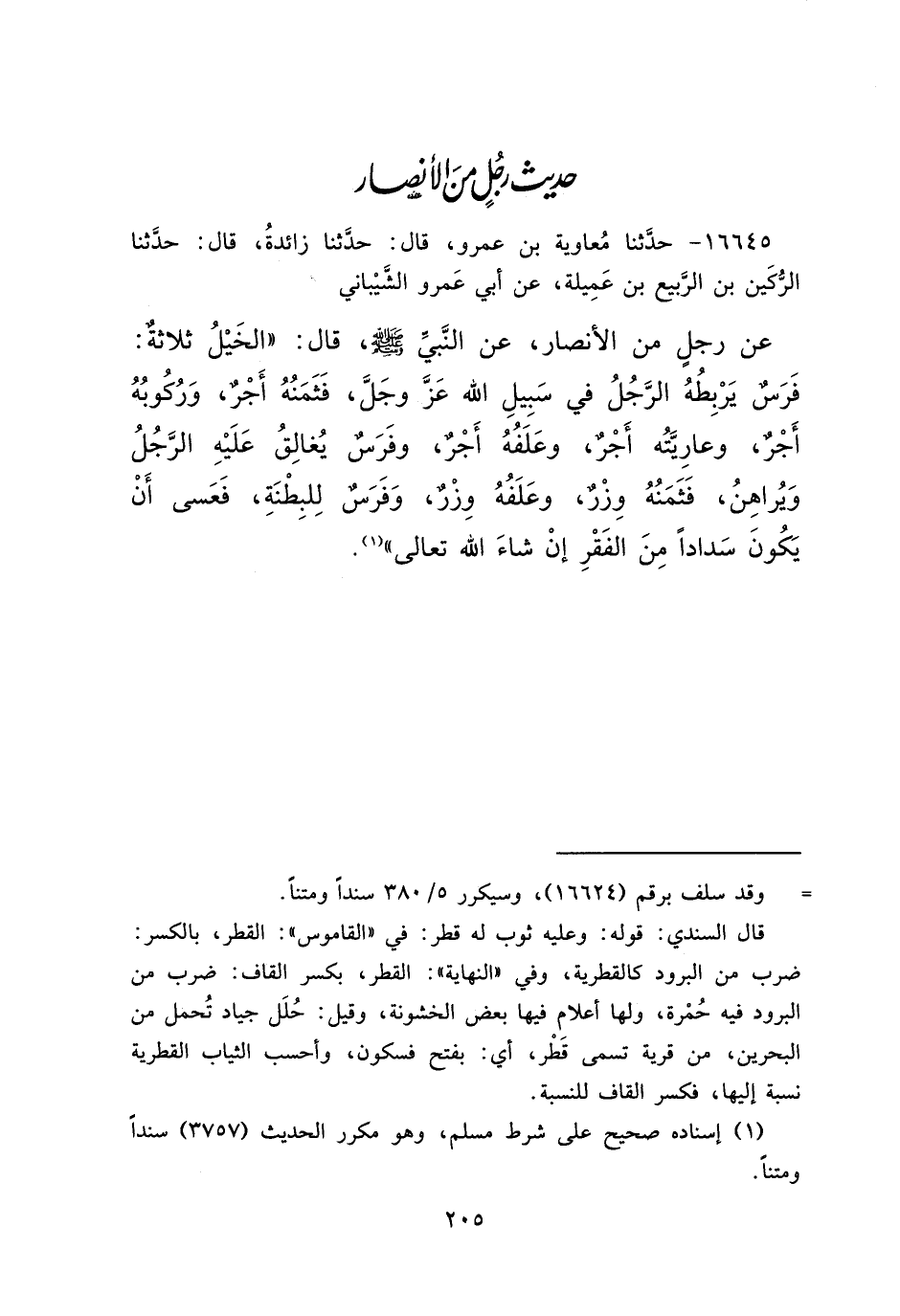 ١٦٦٤٥ - حَدَّثَنَا مُعَاوِيَةُ بْنُ عَمْرٍو، قَالَ: حَدَّثَنَا زَائِدَةُ، قَالَ: حَدَّثَنَا الرُّكَيْنُ بْنُ الرَّبِيعِ بْنِ عُمَيْلَةَ، عَنْ أَبِي عَمْرٍو الشَّيْبَانِيِّ، عَنْ رَجُلٍ مِنَ الْأَنْصَارِ، عَنِ النَّبِيِّ قَالَ: " الْخَيْلُ ثَلَاثَةٌ: فَرَسٌ يَرْبِطُهُ الرَّجُلُ فِي سَبِيلِ اللهِ عَزَّ وَجَلَّ، فَثَمَنُهُ أَجْرٌ، وَرُكُوبُهُ أَجْرٌ، وَعَارِيَتُهُ أَجْرٌ، وَعَلَفُهُ أَجْرٌ، وَفَرَسٌ يُغَالِقُ عَلَيْهِ الرَّجُلُ وَيُرَاهِنُ، فَثَمَنُهُ وِزْرٌ، وَعَلَفُهُ وِزْرٌ، وَفَرَسٌ لِلْبِطْنَةِ، فَعَسَى أَنْ يَكُونَ سَدَادًا مِنَ الْفَقْرِ إِنْ شَاءَ اللهُ تَعَالَى " (١)