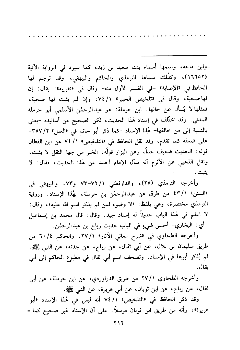 فمثلها لا يُسأل عن حالها ابن حرملة: هو عبد الرحمن الأسلمي أبو حرملة المدني. وقد أختُلف في إسناد هذا الحديث، لكن الصحيح من أسانيده- يعني بالنسبة إلى من خالفها- هذا الإسناد- كما ذكر أبو حاتم في "العلل" ٢/٣٥٧- على ضعفه كما تقدم، وقد نقل الحافظ في "التلخيص" ١/٧٤ عن ابن القطان قوله: الحديث ضعيف جداً، وعن البزار قولَه: الخبر من جهة النقل لا يثبت، ونقل الذهبي عن الأثرم أنه سأل الإمام أحمد عن هذا الحديث، فقال: لا يثبت.