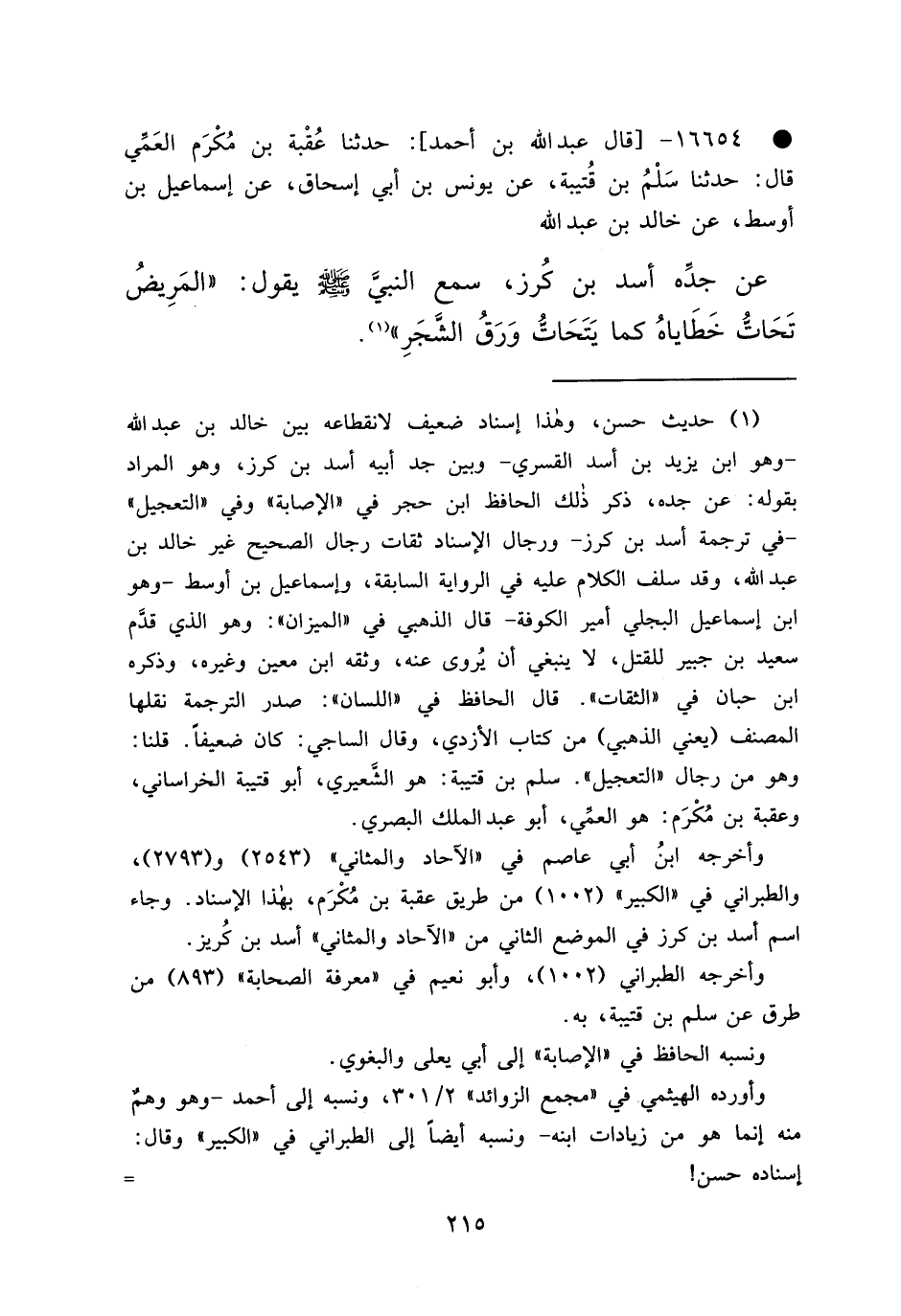 • ١٦٦٥٤ - قَالَ عَبْدُ اللهِ بْنُ أَحْمَدَ: حَدَّثَنَا عُقْبَةُ بْنُ مُكْرَمٍ الْعَمِّيُّ، قَالَ: حَدَّثَنَا سَلْمُ بْنُ قُتَيْبَةَ، عَنْ يُونُسَ بْنِ أَبِي إِسْحَاقَ، عَنْ إِسْمَاعِيلَ بْنِ أَوْسَطَ، عَنْ خَالِدِ بْنِ عَبْدِ اللهِ، عَنْ جَدِّهِ أَسَدِ بْنِ كُرْزٍ، سَمِعَ النَّبِيَّ صَلَّى اللهُ عَلَيْهِ وَسَلَّمَ يَقُولُ: " الْمَرِيضُ تَحَاتُّ خَطَايَاهُ كَمَا يَتَحَاتُّ وَرَقُ الشَّجَرِ " (١)