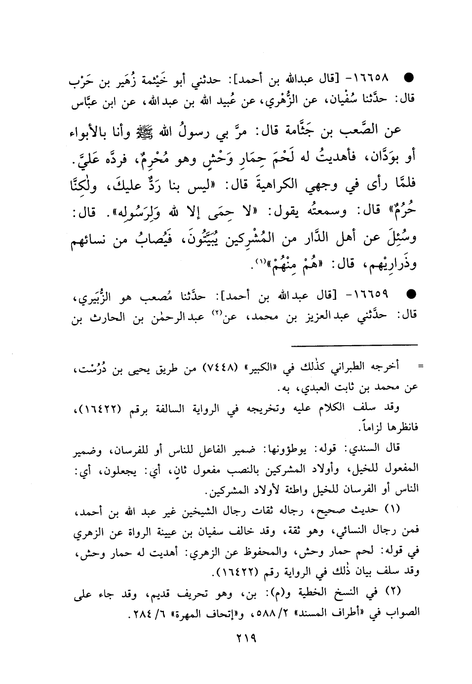 • ١٦٦٥٨ - قَالَ عَبْدُ اللهِ بْنُ أَحْمَدَ: حَدَّثَنِي أَبُو خَيْثَمَةَ زُهَيْرُ بْنُ حَرْبٍ، قَالَ: حَدَّثَنَا سُفْيَانُ، عَنِ الزُّهْرِيِّ، عَنْ عُبَيْدِ اللهِ بْنِ عَبْدِ اللهِ، عَنِ ابْنِ عَبَّاسٍ، عَنِ الصَّعْبِ بْنِ جَثَّامَةَ قَالَ: مَرَّ بِي رَسُولُ اللهِ صَلَّى اللهُ عَلَيْهِ وَسَلَّمَ وَأَنَا بِالْأَبْوَاءِ أَوْ بِوَدَّانَ فَأَهْدَيْتُ لَهُ لَحْمَ حِمَارِ وَحْشٍ وَهُوَ مُحْرِمٌ، فَرَدَّهُ عَلَيَّ، فَلَمَّا رَأَى فِي وَجْهِي الْكَرَاهِيَةَ قَالَ: " لَيْسَ بِنَا رَدٌّ عَلَيْكَ وَلَكِنَّا حُرُمٌ "