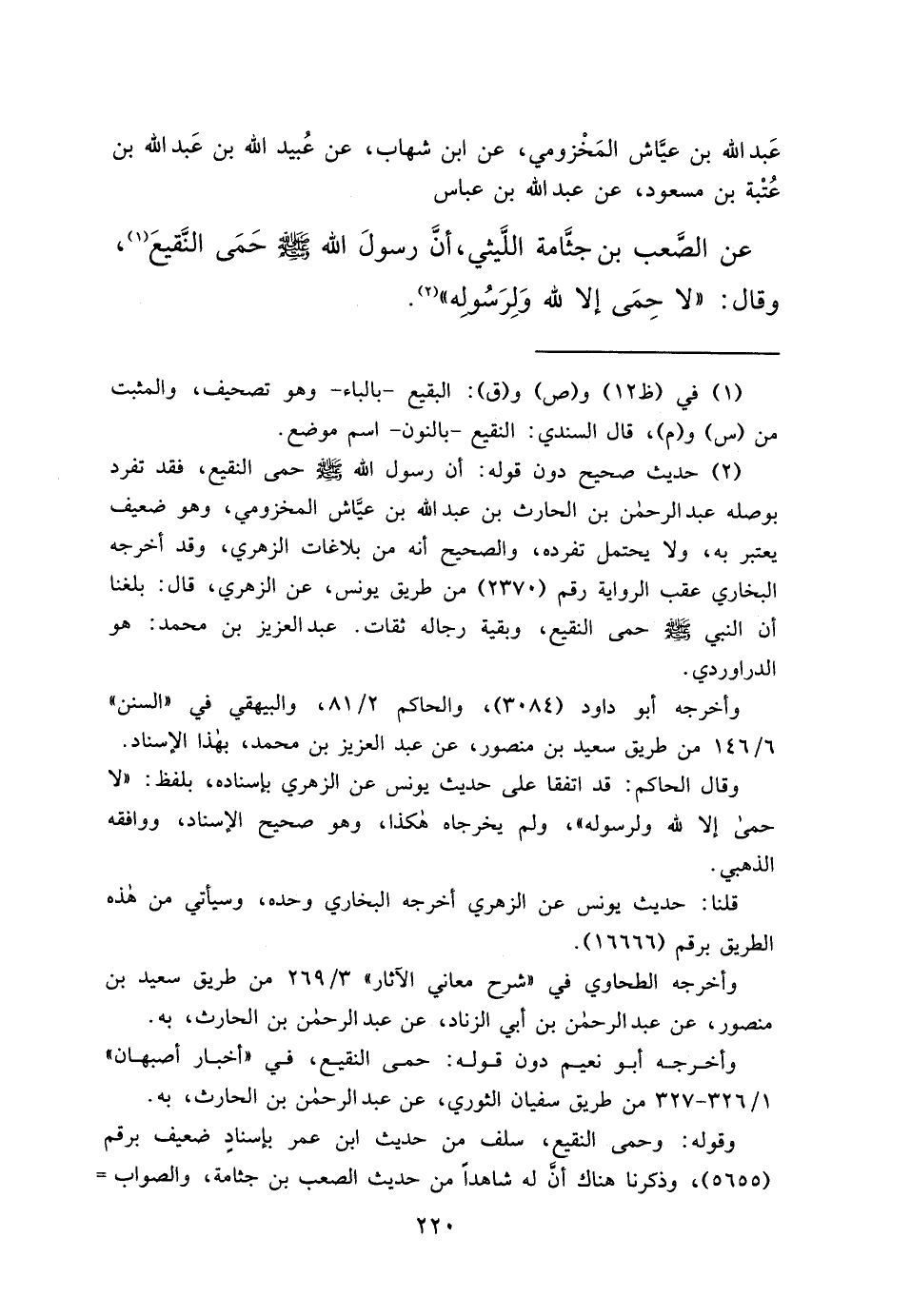 عَبْدِ اللهِ بْنِ عَيَّاشٍ الْمَخْزُومِيُّ، عَنِ ابْنِ شِهَابٍ، عَنْ عُبَيْدِ اللهِ بْنِ عَبْدِ اللهِ بْنِ عُتْبَةَ بْنِ مَسْعُودٍ، عَنْ عَبْدِ اللهِ بْنِ عَبَّاسٍ، عَنِ الصَّعْبِ بْنِ جَثَّامَةَ اللَّيْثِيِّ، أَنَّ رَسُولَ اللهِ صَلَّى اللهُ عَلَيْهِ وَسَلَّمَ حَمَى النَّقِيعَ (١) وَقَالَ: " لَا حِمَى إِلَّا لِلَّهِ وَلِرَسُولِهِ " (٢)