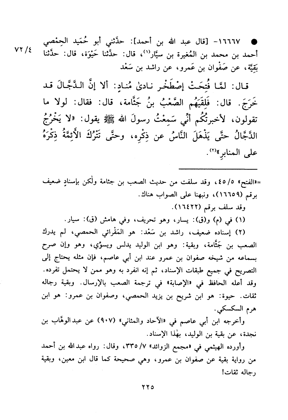 • ١٦٦٦٧ - قَالَ عَبْدُ اللهِ بْنُ أَحْمَدَ حَدَّثَنِي أَبُو حُمَيْدٍ الْحِمْصِيُّ أَحْمَدُ بْنُ مُحَمَّدِ بْنِ الْمُغِيرَةِ بْنِ سَيَارٍ (١) ، قَالَ: حَدَّثَنَا حَيْوَةُ، قَالَ: حَدَّثَنَا بَقِيَّةُ، عَنْ صَفْوَانَ بْنِ عَمْرٍو، عَنْ رَاشِدِ بْنِ سَعْدٍ قَالَ: لَمَّا فُتِحَتْ إِصْطَخْرُ نَادَى مُنَادٍ: أَلَا إِنَّ الدَّجَّالَ قَدْ خَرَجَ، قَالَ: فَلَقِيَهُمُ الصَّعْبُ بْنُ جَثَّامَةَ قَالَ: فَقَالَ: لَوْلَا مَا تَقُولُونَ لَأَخْبَرْتُكُمْ أَنِّي سَمِعْتُ رَسُولَ اللهِ صَلَّى اللهُ عَلَيْهِ وَسَلَّمَ يَقُولُ: " لَا يَخْرُجُ الدَّجَّالُ حَتَّى يَذْهَلَ النَّاسُ عَنْ ذِكْرِهِ، وَحَتَّى تَتْرُكَ الْأَئِمَّةُ ذِكْرَهُ عَلَى الْمَنَابِرِ " (٢)