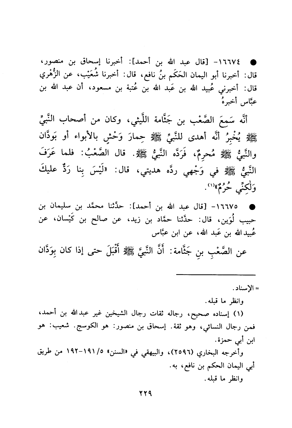 • ١٦٦٧٤ - قَالَ عَبْدُ اللهِ بْنُ أَحْمَدَ أَخْبَرَنَا إِسْحَاقُ بْنُ مَنْصُورٍ، قَالَ: أَخْبَرَنَا أَبُو الْيَمَانِ الْحَكَمُ بْنُ نَافِعٍ قَالَ: أَخْبَرَنَا شُعَيْبٌ، عَنِ الزُّهْرِيِّ قَالَ: أَخْبَرَنِي عُبَيْدُ اللهِ بْنُ عَبْدِ اللهِ بْنِ عُتْبَةَ بْنِ مَسْعُودٍ، أَنَّ عَبْدَ اللهِ بْنَ عَبَّاسٍ أَخْبَرَهُ، أَنَّهُ سَمِعَ الصَّعْبَ بْنَ جَثَّامَةَ اللَّيْثِيَّ، وَكَانَ مِنْ أَصْحَابِ النَّبِيِّ صَلَّى اللهُ عَلَيْهِ وَسَلَّمَ يُخْبِرُ، أَنَّهُ أَهْدَى لِلنَّبِيِّ صَلَّى اللهُ عَلَيْهِ وَسَلَّمَ حِمَارَ وَحْشٍ بِالْأَبْوَاءِ، أَوْ بِوَدَّانَ وَالنَّبِيُّ مُحْرِمٌ، فَرَدَّهُ النَّبِيُّ صَلَّى اللهُ عَلَيْهِ وَسَلَّمَ، قَالَ الصَّعْبُ: فَلَمَّا عَرَفَ النَّبِيُّ صَلَّى اللهُ عَلَيْهِ وَسَلَّمَ فِي وَجْهِي رَدَّهُ هَدِيَّتِي قَالَ: " لَيْسَ بِنَا رَدٌّ عَلَيْكَ وَلَكِنِّي حُرُمٌ " (١)