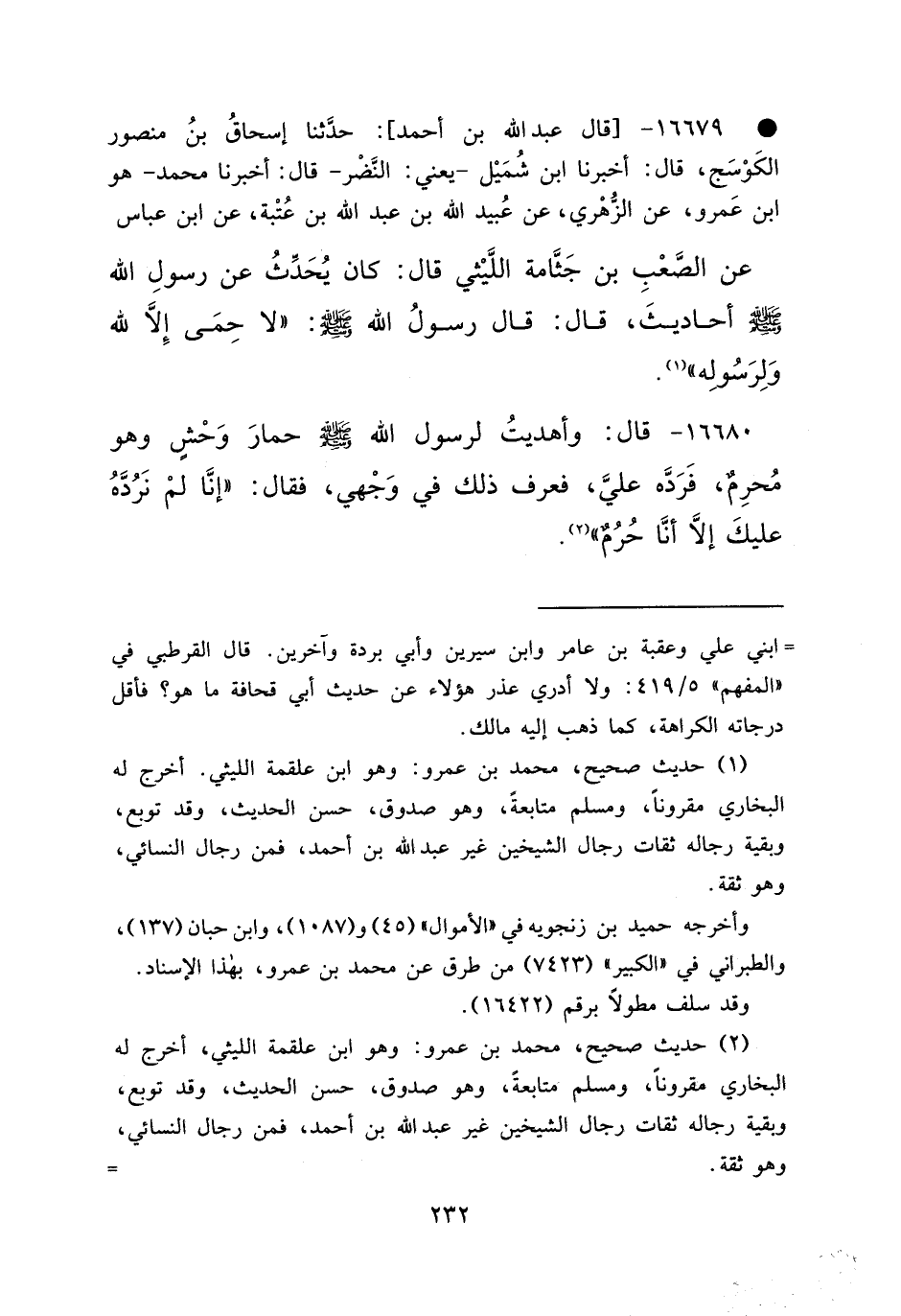 • ١٦٦٧٩ - قَالَ عَبْدُ اللهِ بْنُ أَحْمَدَ: حَدَّثَنَا إِسْحَاقُ بْنُ مَنْصُورٍ الْكَوْسَجُ، قَالَ: أَخْبَرَنَا ابْنُ شُمَيْلٍ يَعْنِي النَّضْرَ، قَالَ: أَخْبَرَنَا مُحَمَّدٌ هُوَ ابْنُ عَمْرٍو، عَنِ الزُّهْرِيِّ، عَنْ عُبَيْدِ اللهِ بْنِ عَبْدِ اللهِ بْنِ عُتْبَةَ، عَنِ ابْنِ عَبَّاسٍ، عَنِ الصَّعْبِ بْنِ جَثَّامَةَ اللَّيْثِيِّ، قَالَ: كَانَ يُحَدِّثُ عَنْ رَسُولِ اللهِ صَلَّى اللهُ عَلَيْهِ وَسَلَّمَ أَحَادِيثَ، قَالَ: قَالَ رَسُولُ اللهِ صَلَّى اللهُ عَلَيْهِ وَسَلَّمَ: " لَا حِمَى إِلَّا لِلَّهِ وَلِرَسُولِهِ " (١)