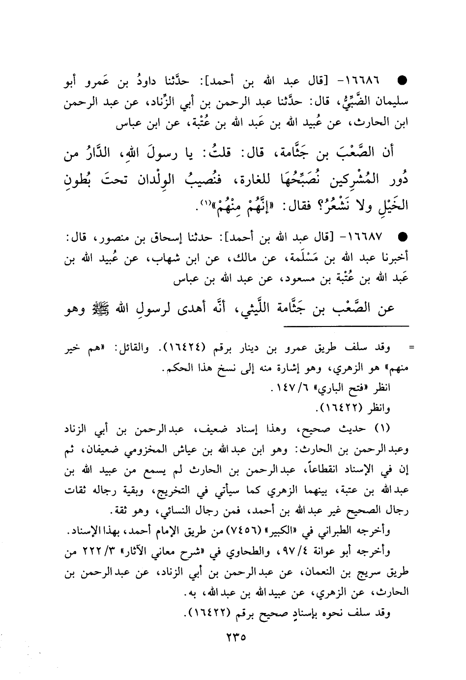 • ١٦٦٨٦ - قَالَ عَبْدُ اللهِ بْنُ أَحْمَدَ: حَدَّثَنَا دَاوُدُ بْنُ عَمْرٍو أَبُو سُلَيْمَانَ الضَّبِّيُّ، قَالَ: حَدَّثَنَا عَبْدُ الرَّحْمَنِ بْنُ أَبِي الزِّنَادِ، عَنْ عَبْدِ الرَّحْمَنِ بْنِ الْحَارِثِ، عَنْ عُبَيْدِ اللهِ بْنِ عَبْدِ اللهِ بْنِ عُتْبَةَ، عَنِ ابْنِ عَبَّاسٍ، أَنَّ الصَّعْبَ بْنَ جَثَّامَةَ، قَالَ: قُلْتُ: يَا رَسُولَ اللهِ، الدَّارُ مِنْ دُورِ الْمُشْرِكِينَ نُصَبِّحُهَا لِلْغَارَةِ، فَنُصِيبُ الْوِلْدَانَ تَحْتَ بُطُونِ الْخَيْلِ وَلَا نَشْعُرُ؟ فَقَالَ: " إِنَّهُمْ مِنْهُمْ " (١)