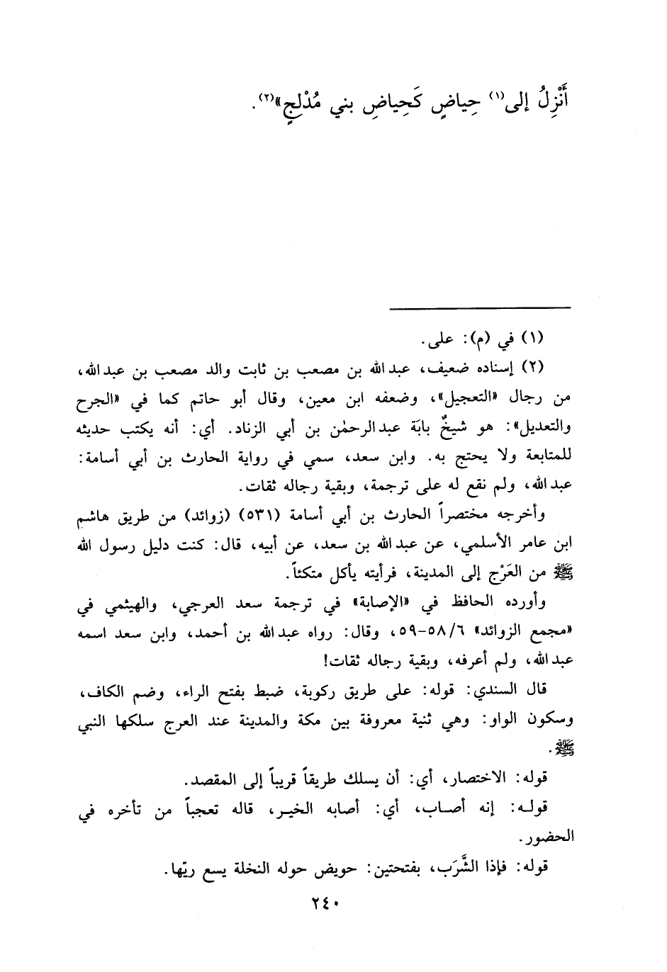 وأخرجه مختصراً الحارث بن أبي أسامة (٥٣١) (زوائد) من طريق هاشم ابن عامر الأسلمي، عن عبد الله بن سعد، عن أبيه، قال: كنت دليل رسول الله صَلَّى اللهُ عَلَيْهِ وَسَلَّمَ من العَرْج إلى المدينة، فرأيته يأكل متكئاً.