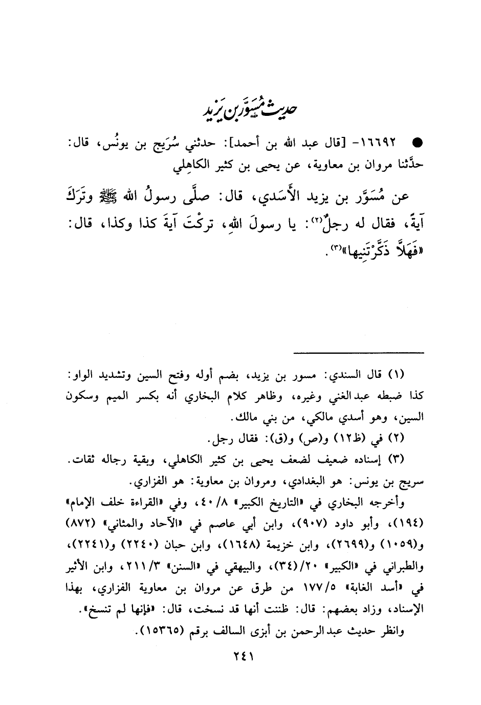 • ١٦٦٩٢ - قَالَ عَبْدُ اللهِ بْنُ أَحْمَدَ: حَدَّثَنِي سُرَيْجُ بْنُ يُونُسَ، قَالَ: حَدَّثَنَا مَرْوَانُ بْنُ مُعَاوِيَةَ، عَنْ يَحْيَى بْنِ كَثِيرٍ الْكَاهِلِيِّ، عَنْ مِسْوَرِ بْنِ يَزِيدَ الْأَسَدِيِّ، قَالَ: صَلَّى رَسُولُ اللهِ صَلَّى اللهُ عَلَيْهِ وَسَلَّمَ وَتَرَكَ آيَةً، فَقَالَ لَهُ رَجُلٌ (٢) : يَا رَسُولَ اللهِ، تَرَكْتَ آيَةَ كَذَا وَكَذَا، قَالَ: " فَهَلَّا ذَكَّرْتَنِيهَا " (٣)