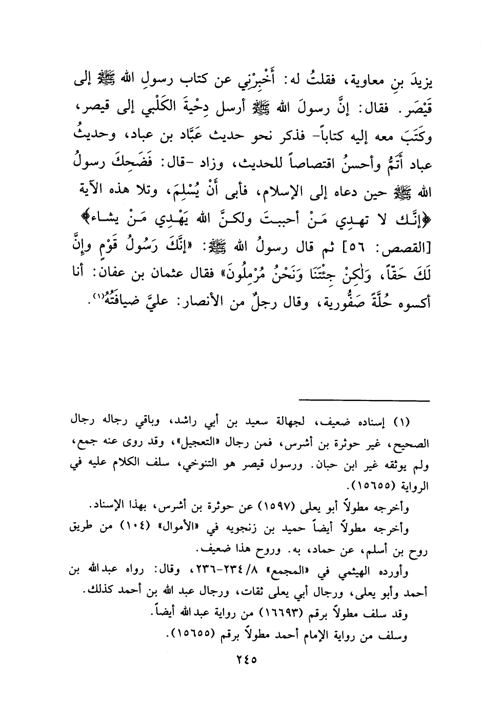 يَزِيدَ بْنِ مُعَاوِيَةَ، فَقُلْتُ لَهُ: أَخْبِرْنِي عَنْ كِتَابِ رَسُولِ اللهِ صَلَّى اللهُ عَلَيْهِ وَسَلَّمَ إِلَى قَيْصَرَ. فَقَالَ: إِنَّ رَسُولَ اللهِ صَلَّى اللهُ عَلَيْهِ وَسَلَّمَ أَرْسَلَ دِحْيَةَ الْكَلْبِيَّ إِلَى قَيْصَرَ، وَكَتَبَ مَعَهُ إِلَيْهِ كِتَابًا، - فَذَكَرَ نَحْوَ حَدِيثِ عَبَّادِ بْنِ عَبَّادٍ " وَحَدِيثُ عَبَّادٍ أَتَمُّ وَأَحْسَنُ اقْتِصَاصًا لِلْحَدِيثِ " وَزَادَ قَالَ: فَضَحِكَ رَسُولُ اللهِ صَلَّى اللهُ عَلَيْهِ وَسَلَّمَ حِينَ دَعَاهُ إِلَى الْإِسْلَامِ، فَأَبَى أَنْ يُسْلِمَ، وَتَلَا هَذِهِ الْآيَةَ {إِنَّكَ لَا تَهْدِي مَنْ أَحْبَبْتَ وَلَكِنَّ اللهَ يَهْدِي مَنْ يَشَاءُ} [القصص: ٥٦] ثُمَّ قَالَ رَسُولُ اللهِ صَلَّى اللهُ عَلَيْهِ وَسَلَّمَ: " إِنَّكَ رَسُولُ قَوْمٍ وَإِنَّ لَكَ حَقًّا، وَلَكِنْ جِئْتَنَا وَنَحْنُ مُرْمِلُونَ " فَقَالَ عُثْمَانُ بْنُ عَفَّانَ: أَنَا أَكْسُوهُ حُلَّةً صَفُورِيَّةً، وَقَالَ رَجُلٌ مِنَ الْأَنْصَارِ: عَلَيَّ ضِيَافَتُهُ (١)