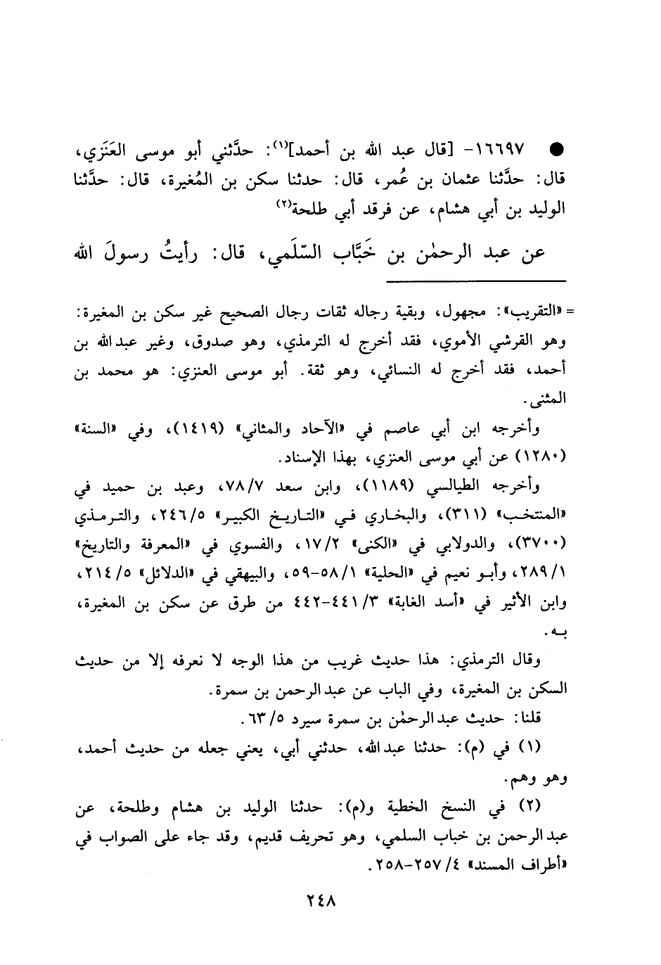 • ١٦٦٩٧ - قَالَ عَبْدُ اللهِ بْنُ أَحْمَدَ (١) حَدَّثَنِي أَبُو مُوسَى الْعَنَزِيُّ، قَالَ: حَدَّثَنَا عُثْمَانُ بْنُ عُمَرَ، قَالَ: حَدَّثَنَا سَكَنُ بْنُ الْمُغِيرَةِ، قَالَ: حَدَّثَنَا الْوَلِيدُ بْنُ أَبِي هِشَامٍ، عَنْ فَرْقَدٍ أَبِي طَلْحَةَ (٢) ، عَنْ عَبْدِ الرَّحْمَنِ بْنِ خَبَّابٍ السُّلَمِيِّ، قَالَ: رَأَيْتُ رَسُولَ اللهِ صَلَّى اللهُ عَلَيْهِ وَسَلَّمَ