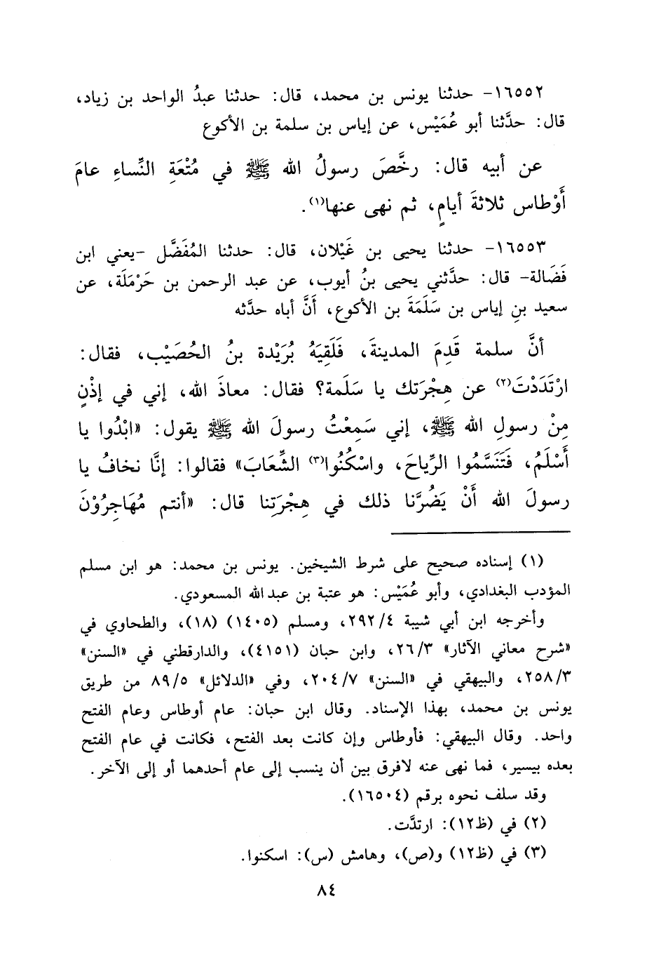١٦٥٥٢ - حَدَّثَنَا يُونُسُ بْنُ مُحَمَّدٍ، قَالَ: حَدَّثَنَا عَبْدُ الْوَاحِدِ بْنُ زِيَادٍ، قَالَ: حَدَّثَنَا أَبُو عُمَيْسٍ، عَنْ إِيَاسِ بْنِ سَلَمَةَ بْنِ الْأَكْوَعِ، عَنْ أَبِيهِ قَالَ: " رَخَّصَ رَسُولُ اللهِ صَلَّى اللهُ عَلَيْهِ وَسَلَّمَ فِي مُتْعَةِ النِّسَاءِ عَامَ أَوْطَاسٍ ثَلَاثَةَ أَيَّامٍ ثُمَّ نَهَى عَنْهَا " (١)