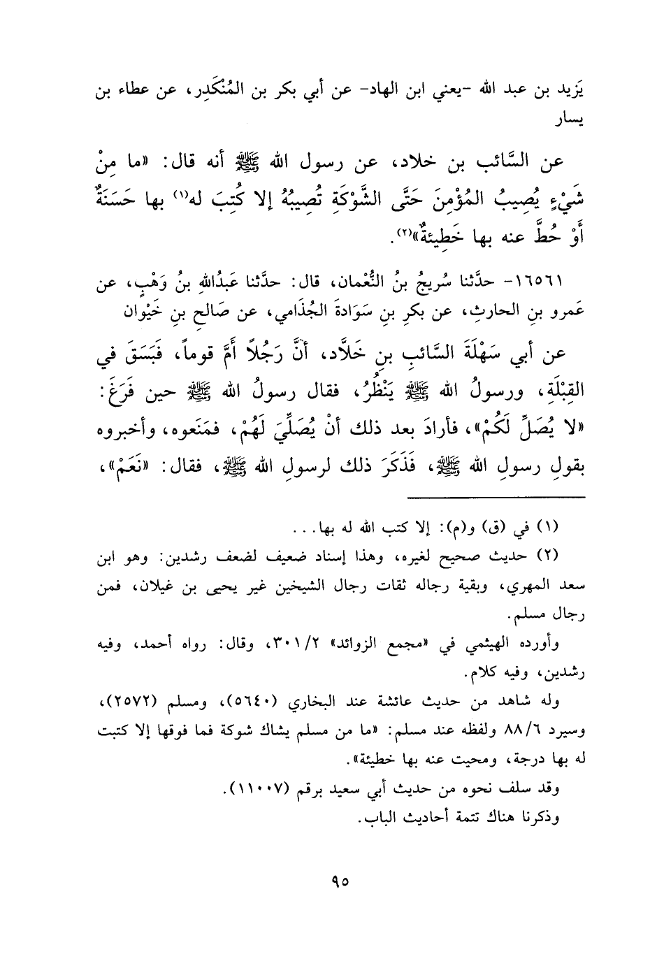 يَزِيدُ بْنُ عَبْدِ اللهِ يَعْنِي ابْنَ الْهَادِ، عَنْ أَبِي بَكْرِ بْنِ الْمُنْكَدِرِ، عَنْ عَطَاءِ بْنِ يَسَارٍ، عَنِ السَّائِبِ بْنِ خَلَّادٍ، عَنْ رَسُولِ اللهِ صَلَّى اللهُ عَلَيْهِ وَسَلَّمَ أَنَّهُ قَالَ: " مَا مِنْ شَيْءٍ يُصِيبُ الْمُؤْمِنَ حَتَّى الشَّوْكَةِ تُصِيبُهُ إِلَّا كَتَبَ لَهُ (١) بِهَا حَسَنَةً أَوَ حَطَّ عَنْهُ بِهَا خَطِيئَةً " (٢)