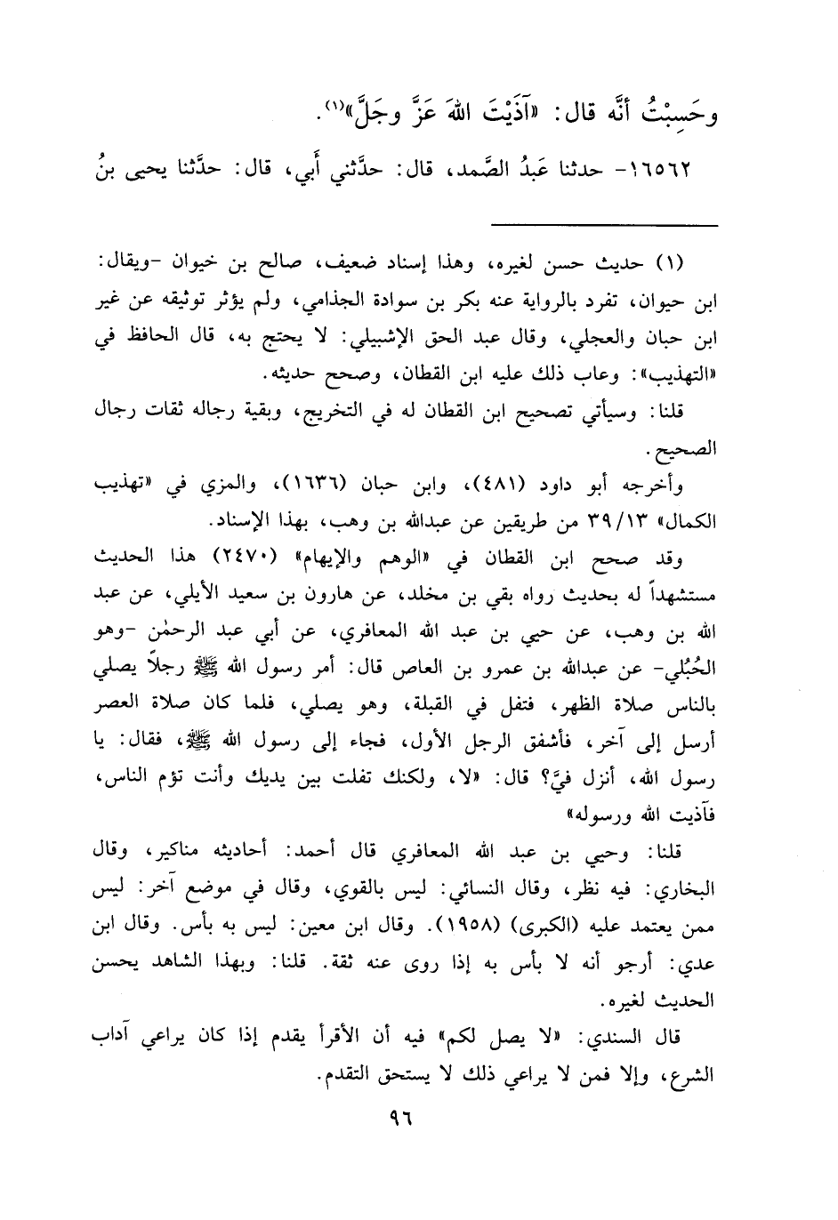 قلنا: وحيي بن عبد الله المعافري قال أحمد: أحاديثه مناكير، وقال البخاري: فيه نظر، وقال النسائي: ليس بالقوي، وقال في موضع آخر: ليس ممن يعتمد عليه (الكبرى) (١٩٥٨) . وقال ابن معين: ليس به بأس. وقال ابن عدي: أرجو أنه لا بأس به إذا روى عنه ثقة. قلنا: وبهذا الشاهد يحسن