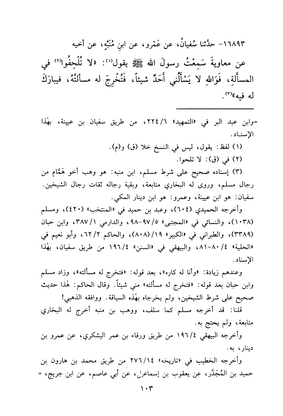 ١٦٨٩٣ - حَدَّثَنَا سُفْيَانُ، عَنْ عَمْرٍو، عَنِ ابْنِ مُنَبِّهٍ، عَنْ أَخِيهِ، عَنْ مُعَاوِيَةَ، سَمِعْتُ رَسُولَ اللهِ صَلَّى اللهُ عَلَيْهِ وَسَلَّمَ يَقُولُ (١) : " لَا تُلْحِفُوا (٢) فِي الْمَسْأَلَةِ، فَوَاللهِ لَا يَسْأَلُنِي أَحَدٌ شَيْئًا، فَتَخْرُجَ لَهُ مَسْأَلَتُهُ، فَيُبَارَكَ لَهُ فِيهِ " (٣)