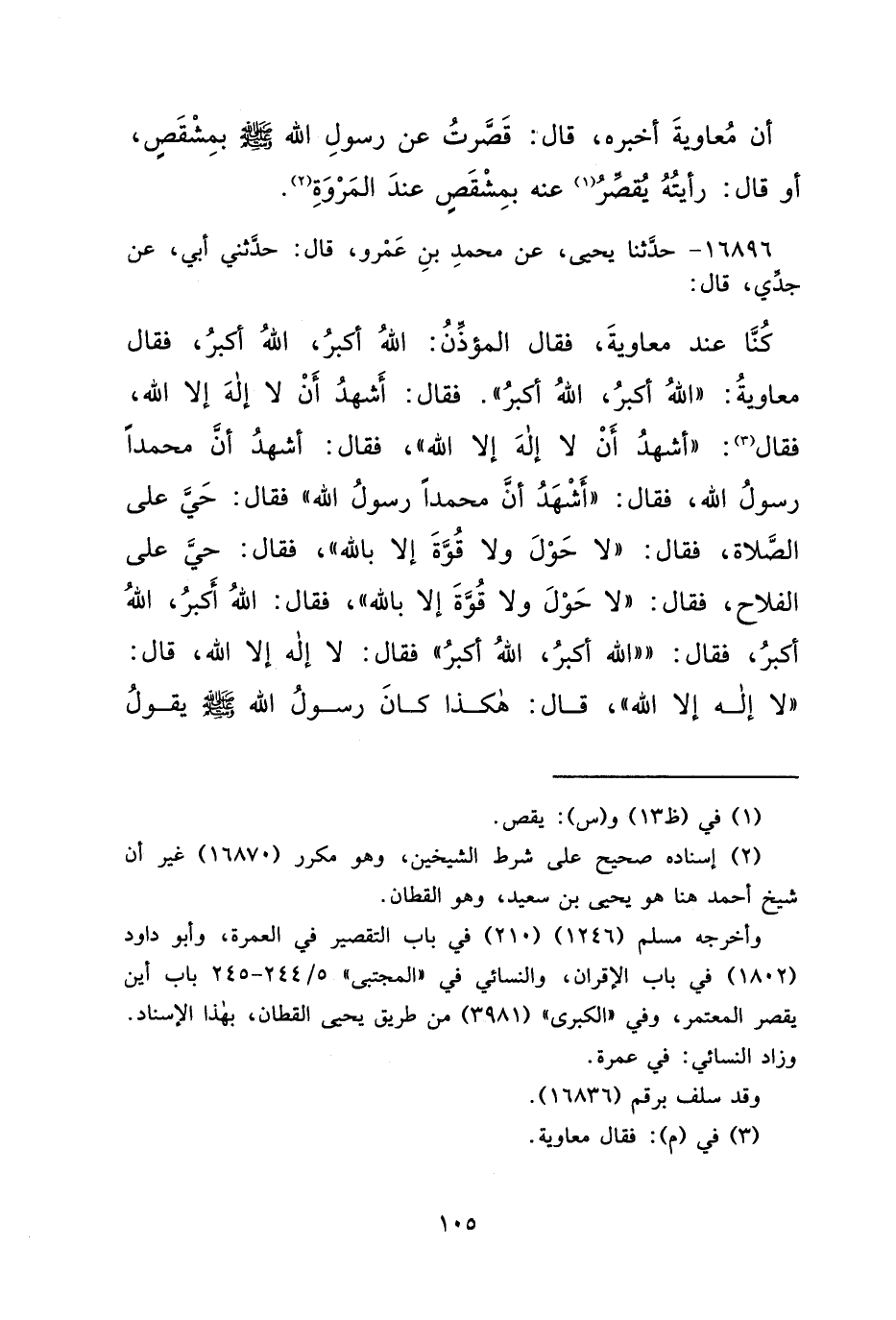 ١٦٨٩٦ - حَدَّثَنَا يَحْيَى، عَنْ مُحَمَّدِ بْنِ عَمْرٍو، قَالَ: حَدَّثَنِي أَبِي، عَنْ جَدِّي، قَالَ: كُنَّا عِنْدَ مُعَاوِيَةَ، فَقَالَ الْمُؤَذِّنُ: اللهُ أَكْبَرُ، اللهُ أَكْبَرُ، فَقَالَ مُعَاوِيَةُ: " اللهُ أَكْبَرُ، اللهُ أَكْبَرُ ". فَقَالَ: أَشْهَدُ أَنْ لَا إِلَهَ إِلَّا اللهُ، فَقَالَ (٣) : " أَشْهَدُ أَنْ لَا إِلَهَ إِلَّا اللهُ "، فَقَالَ: أَشْهَدُ أَنَّ مُحَمَّدًا رَسُولُ اللهِ، فَقَالَ: " أَشْهَدُ أَنَّ مُحَمَّدًا رَسُولُ اللهِ "، فَقَالَ: حَيَّ عَلَى الصَّلَاةِ، فَقَالَ: " لَا حَوْلَ وَلَا قُوَّةَ إِلَّا بِاللهِ "، فَقَالَ: حَيَّ عَلَى الْفَلَاحِ، فَقَالَ: " لَا حَوْلَ وَلَا قُوَّةَ إِلَّا بِاللهِ "، فَقَالَ: اللهُ أَكْبَرُ اللهُ أَكْبَرُ، فَقَالَ: " اللهُ أَكْبَرُ اللهُ أَكْبَرُ "، فَقَالَ: لَا إِلَهَ إِلَّا اللهُ، قَالَ: " لَا إِلَهَ إِلَّا اللهُ "، قَالَ: هَكَذَا كَانَ رَسُولُ اللهِ صَلَّى اللهُ عَلَيْهِ وَسَلَّمَ يَقُولُ