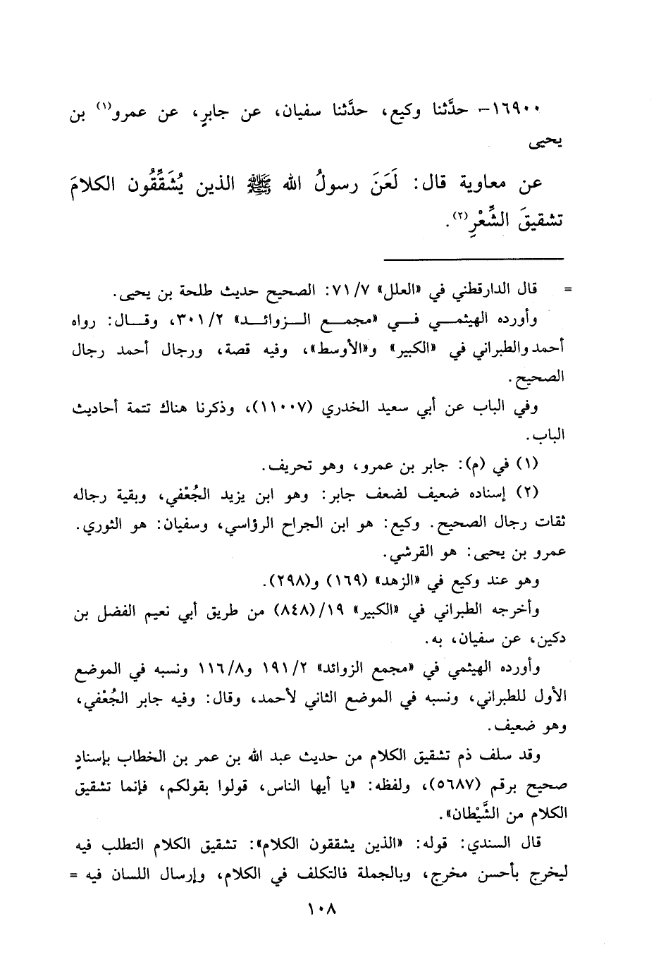 ١٦٩٠٠ - حَدَّثَنَا وَكِيعٌ، حَدَّثَنَا سُفْيَانُ، عَنْ جَابِرٍ، عَنْ عَمْرِو (١) بْنِ يَحْيَى، عَنْ مُعَاوِيَةَ، قَالَ: " لَعَنَ رَسُولُ اللهِ صَلَّى اللهُ عَلَيْهِ وَسَلَّمَ الَّذِينَ يُشَقِّقُونَ الْكَلَامَ تَشْقِيقَ الشِّعْرِ " (٢)