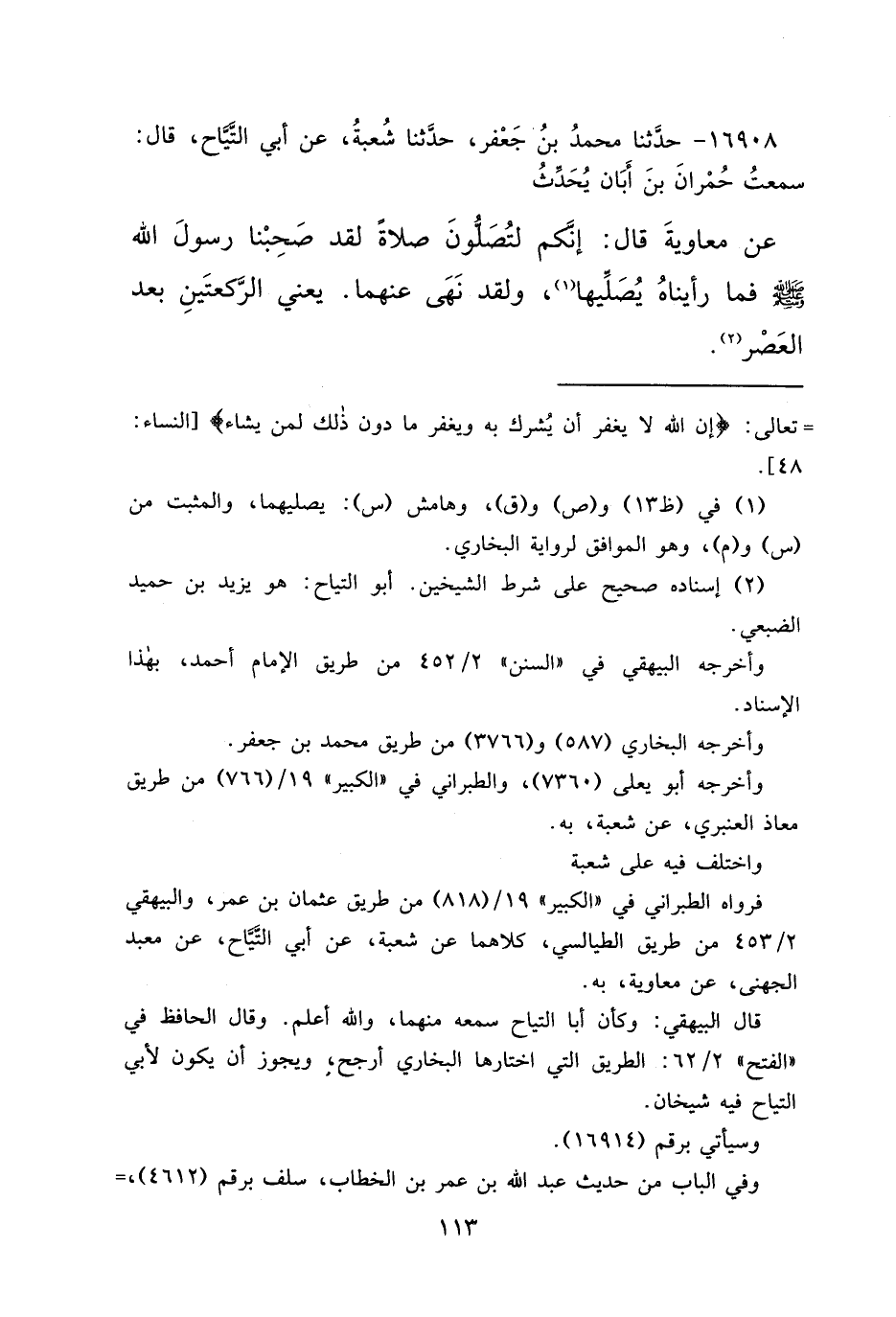 ١٦٩٠٨ - حَدَّثَنَا مُحَمَّدُ بْنُ جَعْفَرٍ، حَدَّثَنَا شُعْبَةُ، عَنْ أَبِي التَّيَّاحِ، قَالَ: سَمِعْتُ حُمْرَانَ بْنَ أَبَانَ، يُحَدِّثُ عَنْ مُعَاوِيَةَ، قَالَ: " إِنَّكُمْ لَتُصَلُّونَ صَلَاةً لَقَدْ صَحِبْنَا رَسُولَ اللهِ صَلَّى اللهُ عَلَيْهِ وَسَلَّمَ فَمَا رَأَيْنَاهُ يُصَلِّيهَا (١) ، وَلَقَدْ نَهَى عَنْهُمَا " يَعْنِي الرَّكْعَتَيْنِ بَعْدَ الْعَصْرِ (٢)