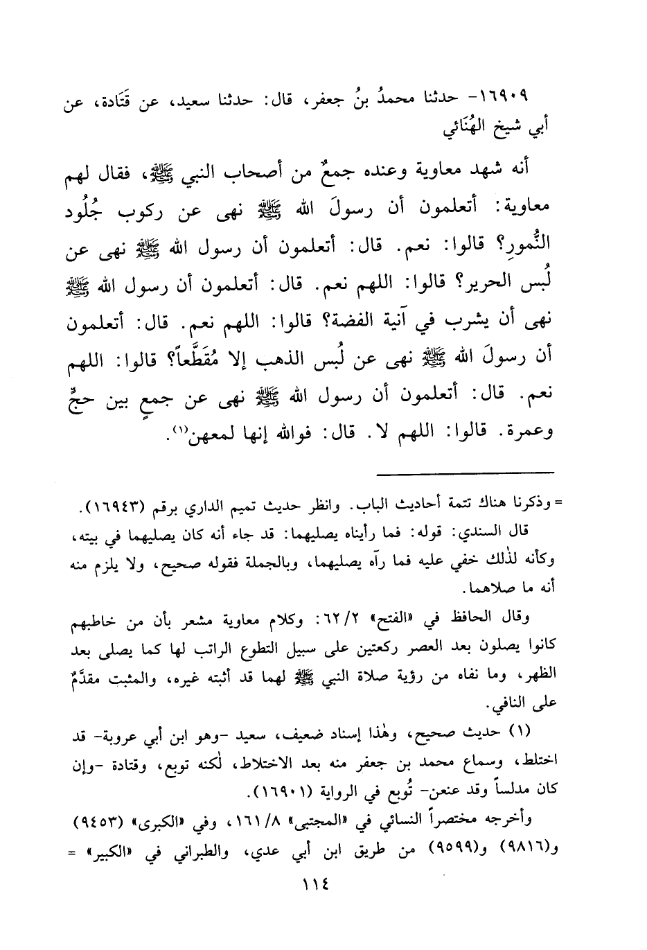 ١٦٩٠٩ - حَدَّثَنَا مُحَمَّدُ بْنُ جَعْفَرٍ، قَالَ: حَدَّثَنَا سَعِيدٌ، عَنْ قَتَادَةَ، عَنْ أَبِي شَيْخٍ الْهُنَائِيِّ، أَنَّهُ شَهِدَ مُعَاوِيَةَ وَعِنْدَهُ جَمْعٌ مِنْ أَصْحَابِ النَّبِيِّ صَلَّى اللهُ عَلَيْهِ وَسَلَّمَ، فَقَالَ لَهُمْ مُعَاوِيَةُ: أَتَعْلَمُونَ أَنَّ رَسُولَ اللهِ صَلَّى اللهُ عَلَيْهِ وَسَلَّمَ " نَهَى عَنْ رُكُوبِ جُلُودِ النُّمُورِ "؟ قَالُوا: نَعَمْ. قَالَ: أَتَعْلَمُونَ أَنَّ رَسُولَ اللهِ صَلَّى اللهُ عَلَيْهِ وَسَلَّمَ " نَهَى عَنْ لُبْسِ الْحَرِيرِ "؟ قَالُوا: اللهُمَّ نَعَمْ. قَالَ: أَتَعْلَمُونَ أَنَّ رَسُولَ اللهِ صَلَّى اللهُ عَلَيْهِ وَسَلَّمَ " نَهَى أَنْ يُشْرَبَ فِي آنِيَةِ الْفِضَّةِ "؟ قَالُوا: اللهُمَّ نَعَمْ. قَالَ: أَتَعْلَمُونَ أَنَّ رَسُولَ اللهِ صَلَّى اللهُ عَلَيْهِ وَسَلَّمَ " نَهَى عَنْ لُبْسِ الذَّهَبِ إِلَّا مُقَطَّعًا "؟ قَالُوا: اللهُمَّ نَعَمْ. قَالَ: أَتَعْلَمُونَ أَنَّ رَسُولَ اللهِ صَلَّى اللهُ عَلَيْهِ وَسَلَّمَ " نَهَى عَنْ جَمْعٍ بَيْنَ حَجٍّ وَعُمْرَةٍ "؟ قَالُوا: اللهُمَّ لَا. قَالَ: فَوَاللهِ إِنَّهَا لَمَعَهُنَّ (١)