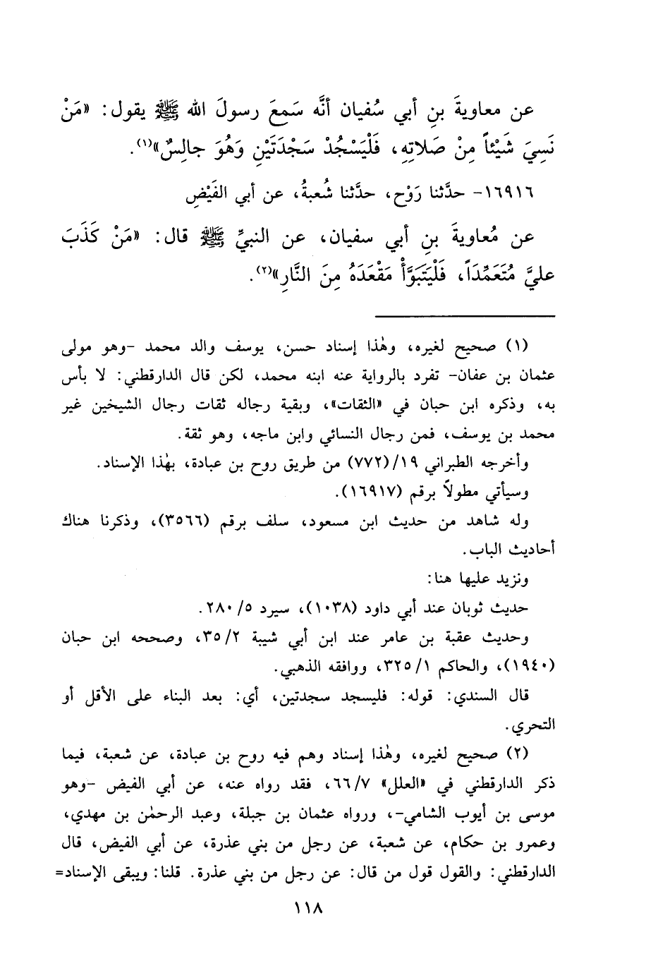 عَنْ مُعَاوِيَةَ بْنِ أَبِي سُفْيَانَ، أَنَّهُ سَمِعَ رَسُولَ اللهِ صَلَّى اللهُ عَلَيْهِ وَسَلَّمَ يَقُولُ: " مَنْ نَسِيَ شَيْئًا مِنْ صَلَاتِهِ، فَلْيَسْجُدْ سَجْدَتَيْنِ وَهُوَ جَالِسٌ " (١)