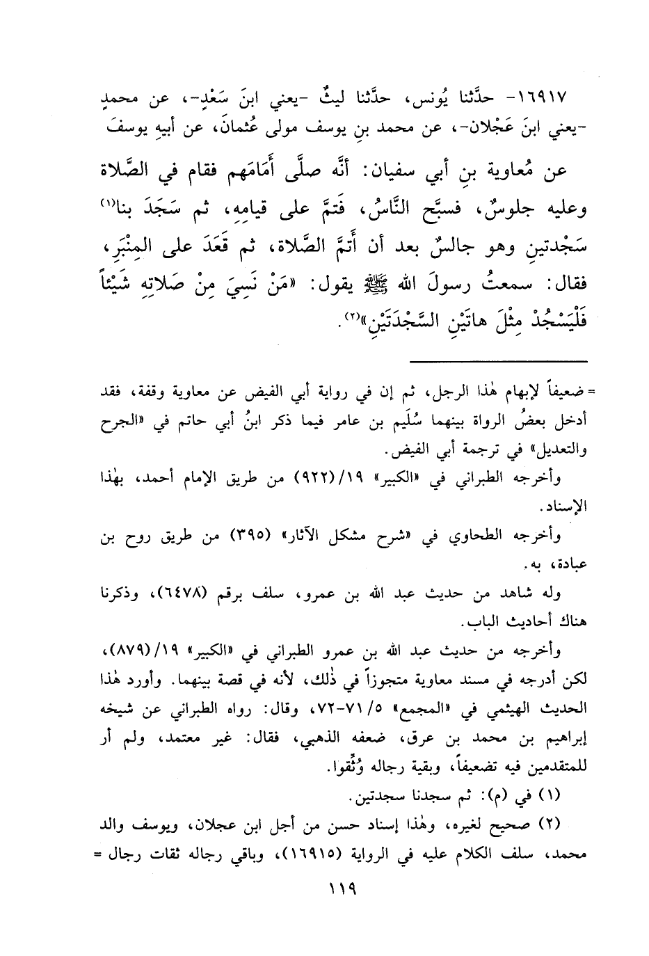 ١٦٩١٧ - حَدَّثَنَا يُونُسُ، حَدَّثَنَا لَيْثٌ يَعْنِي ابْنَ سَعْدٍ، عَنْ مُحَمَّدٍ يَعْنِي ابْنَ عَجْلَانَ، عَنْ مُحَمَّدِ بْنِ يُوسُفَ، مَوْلَى عُثْمَانَ، عَنْ أَبِيهِ يُوسُفَ، عَنْ مُعَاوِيَةَ بْنِ أَبِي سُفْيَانَ: أَنَّهُ صَلَّى أَمَامَهُمْ فَقَامَ فِي الصَّلَاةِ وَعَلَيْهِ جُلُوسٌ، فَسَبَّحَ النَّاسُ، فَتَمَّ عَلَى قِيَامِهِ، ثُمَّ سَجَدَ بِنَا (١) سَجْدَتَيْنِ وَهُوَ جَالِسٌ بَعْدَ أَنْ أَتَمَّ الصَّلَاةَ، ثُمَّ قَعَدَ عَلَى الْمِنْبَرِ فَقَالَ: سَمِعْتُ رَسُولَ اللهِ صَلَّى اللهُ عَلَيْهِ وَسَلَّمَ يَقُولُ: " مَنْ نَسِيَ مِنْ صَلَاتِهِ شَيْئًا فَلْيَسْجُدْ مِثْلَ هَاتَيْنِ السَّجْدَتَيْنِ " (٢)