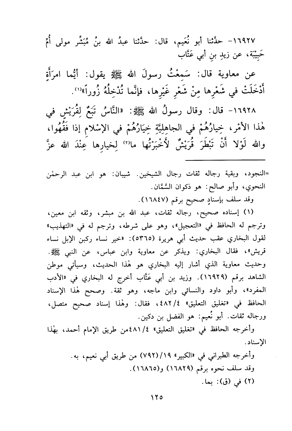 ١٦٩٢٨ - قَالَ: وَقَالَ رَسُولُ اللهِ صَلَّى اللهُ عَلَيْهِ وَسَلَّمَ: " النَّاسُ تَبَعٌ لِقُرَيْشٍ فِي هَذَا الْأَمْرِ، خِيَارُهُمْ فِي الْجَاهِلِيَّةِ خِيَارُهُمْ فِي الْإِسْلَامِ إِذَا فَقِهُوا، وَاللهِ لَوْلَا أَنْ تَبْطَرَ قُرَيْشٌ لَأَخْبَرْتُهَا مَا (٢) لِخِيَارِهَا عِنْدَ اللهِ عَزَّ