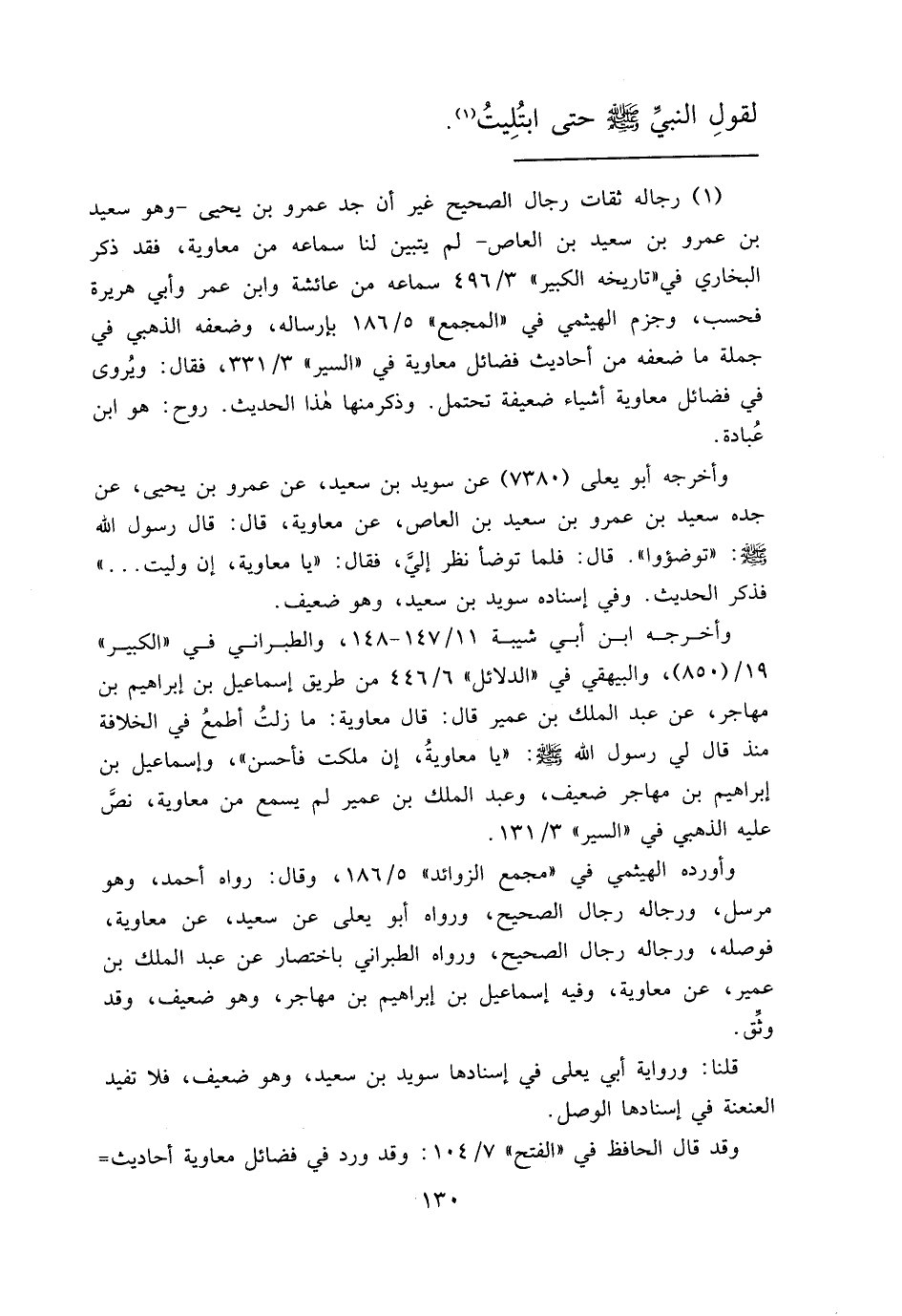 (١) رجاله ثقات رجال الصحيح غير أن جد عمرو بن يحيى- وهو سعيد بن عمرو بن سعيد بن العاص- لم يتبين لنا سماعه من معاوية، فقد ذكر البخاري في "تاريخه الكبير" ٣/٤٩٦ سماعه من عائشة وابن عمر وأبي هريرة فحسب، وجزم الهيثمي في "المجمع " ٥/١٨٦ بإرساله، وضعفه الذهبي في جملة ما ضعفه من أحاديث فضائل معاوية في "السير" ٣/٣٣١، فقال: ويُروى
