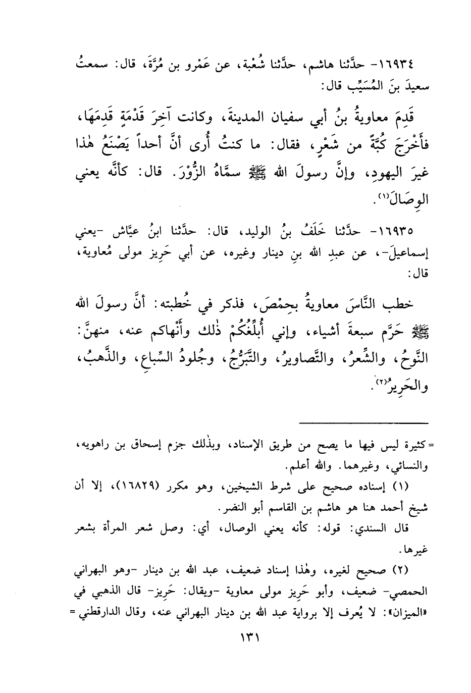 ١٦٩٣٤ - حَدَّثَنَا هَاشِمٌ، حَدَّثَنَا شُعْبَةُ، عَنْ عَمْرِو بْنِ مُرَّةَ، قَالَ: سَمِعْتُ سَعِيدَ بْنَ الْمُسَيِّبِ، قَالَ: قَدِمَ مُعَاوِيَةُ بْنُ أَبِي سُفْيَانَ، الْمَدِينَةَ، وَكَانَتْ آخِرَ قَدْمَةٍ قَدِمَهَا، فَأَخْرَجَ كُبَّةً مِنْ شَعَرٍ، فَقَالَ: مَا كُنْتُ أَرَى أَنَّ أَحَدًا يَصْنَعُ هَذَا غَيْرَ الْيَهُودِ، وَإِنَّ رَسُولَ اللهِ صَلَّى اللهُ عَلَيْهِ وَسَلَّمَ " سَمَّاهُ الزُّورَ " قَالَ: كَأَنَّهُ يَعْنِي الْوِصَالَ (١)