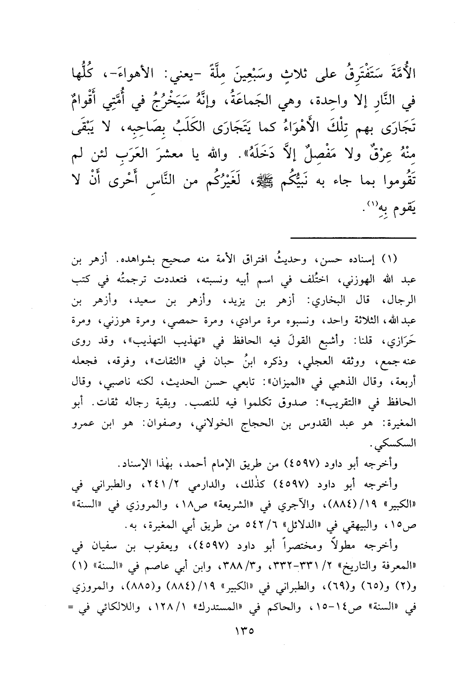 الْأُمَّةَ سَتَفْتَرِقُ عَلَى ثَلَاثٍ وَسَبْعِينَ مِلَّةً - يَعْنِي: الْأَهْوَاءَ -، كُلُّهَا فِي النَّارِ إِلَّا وَاحِدَةً، وَهِيَ الْجَمَاعَةُ، وَإِنَّهُ سَيَخْرُجُ فِي أُمَّتِي أَقْوَامٌ تَجَارَى بِهِمْ تِلْكَ الْأَهْوَاءُ كَمَا يَتَجَارَى الْكَلْبُ بِصَاحِبِهِ، لَا يَبْقَى مِنْهُ عِرْقٌ وَلَا مَفْصِلٌ إِلَّا دَخَلَهُ " وَاللهِ يَا مَعْشَرَ الْعَرَبِ لَئِنْ لَمْ تَقُومُوا بِمَا جَاءَ بِهِ نَبِيُّكُمْ صَلَّى اللهُ عَلَيْهِ وَسَلَّمَ، لَغَيْرُكُمْ مِنَ النَّاسِ أَحْرَى أَنْ لَا يَقُومَ بِهِ (١)