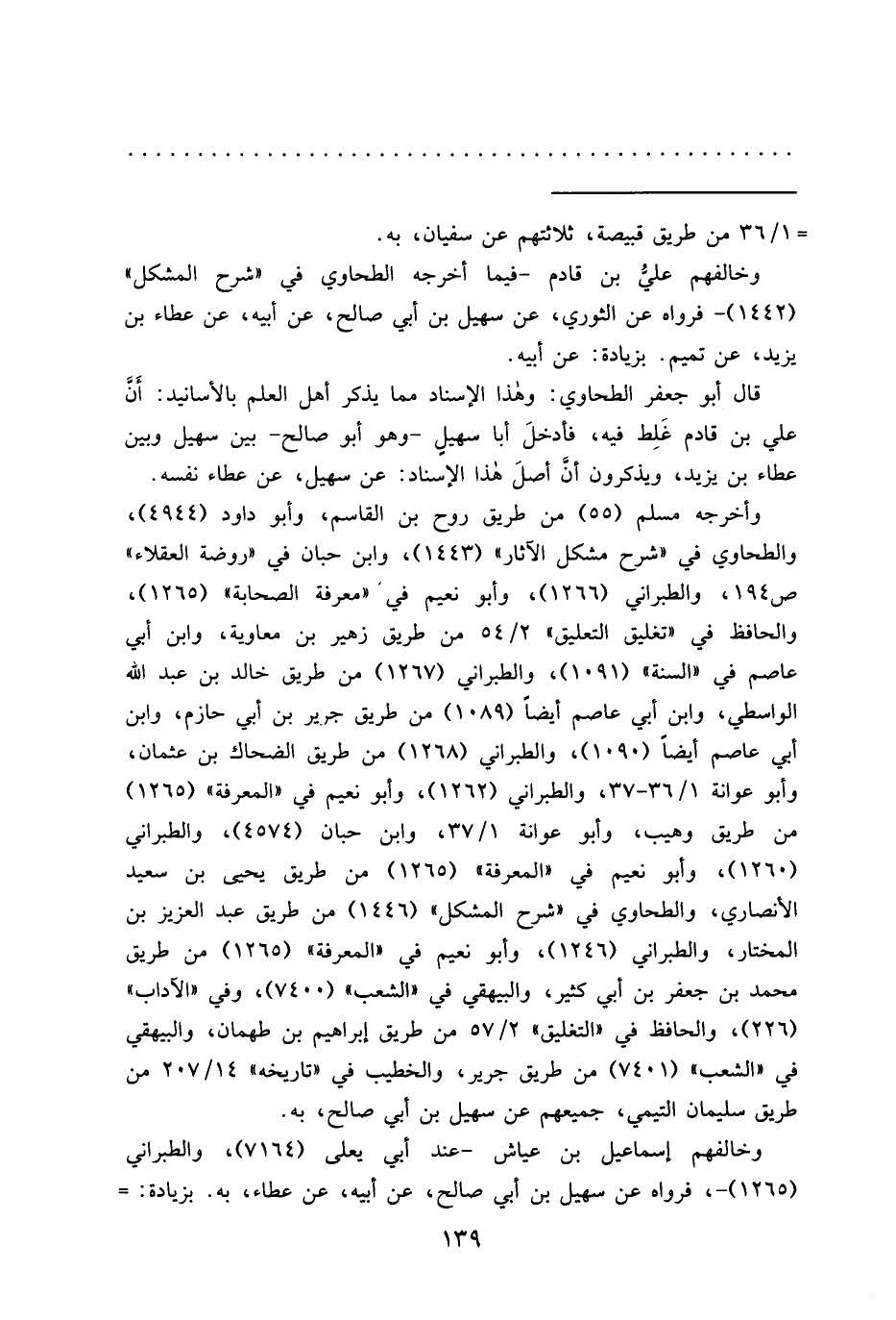 قال أبو جعفر الطحاوي: وهذا الإسناد مما يذكر أهل العلم بالأسانيد: أن علي بن قادم غَلِط فيه، فأدخلَ أبا سهيل- وهو أبو صالح- بين سهيل وبين عطاء بن يزيد، ويذكرون أنَّ أصلَ هذا الإسناد: عن سهيل، عن عطاء نفسه.