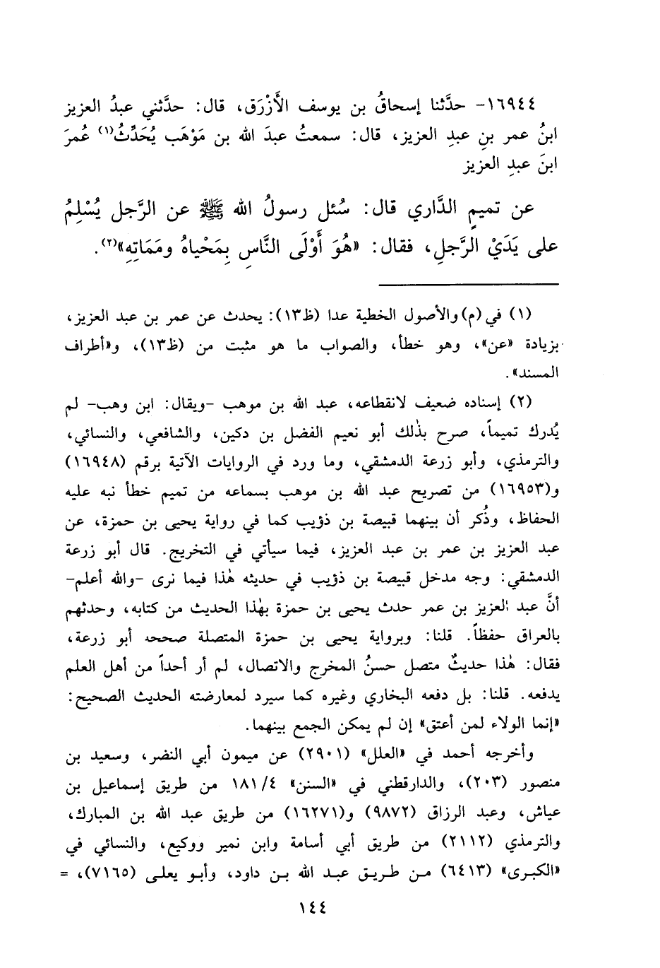 ١٦٩٤٤ - حَدَّثَنَا إِسْحَاقُ بْنُ يُوسُفَ الْأَزْرَقُ، قَالَ: حَدَّثَنِي عَبْدُ الْعَزِيزِ بْنُ عُمَرَ بْنِ عَبْدِ الْعَزِيزِ، قَالَ: سَمِعْتُ عَبْدَ اللهِ بْنَ مَوْهَبٍ، يُحَدِّثُ (١) عُمَرَ بْنَ عَبْدِ الْعَزِيزِ، عَنْ تَمِيمٍ الدَّارِيِّ، قَالَ: سُئِلَ رَسُولُ اللهِ صَلَّى اللهُ عَلَيْهِ وَسَلَّمَ عَنِ الرَّجُلِ يُسْلِمُ عَلَى يَدَيِ الرَّجُلِ، فَقَالَ: " هُوَ أَوْلَى النَّاسِ بِمَحْيَاهُ وَمَمَاتِهِ " (٢)