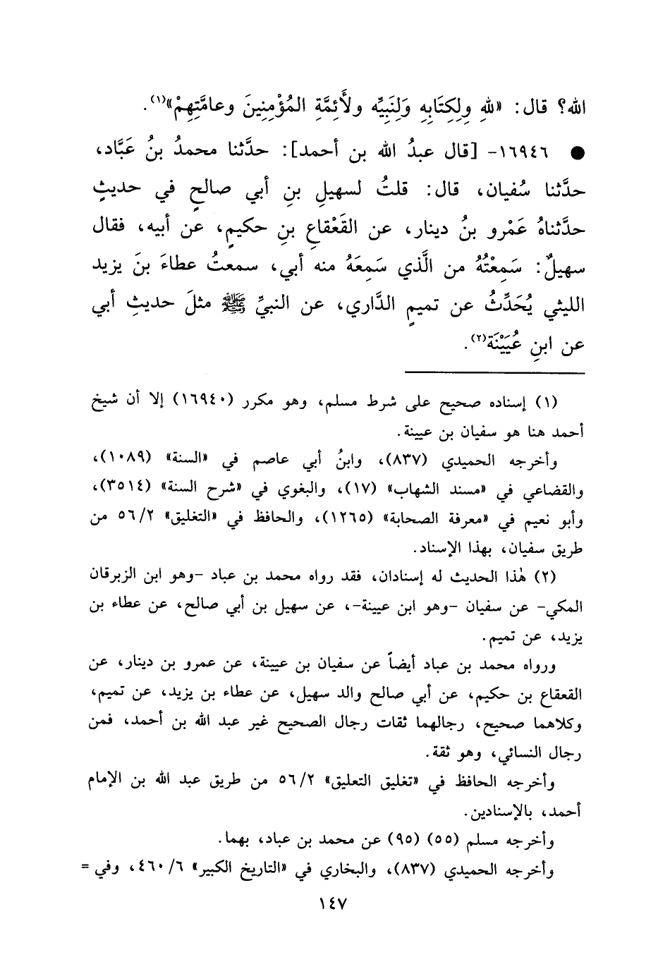 ورواه محمد بن عباد أيضاً عن سفيان بن عيينة، عن عمرو بن دينار، عن القعقاع بن حكيم، عن أبي صالح والد سهيل، عن عطاء بن يزيد، عن تميم، وكلاهما صحيح، رجالهما ثقات رجال الصحيح غير عبد الله بن أحمد، فمن رجال النسائي، وهو ثقة.