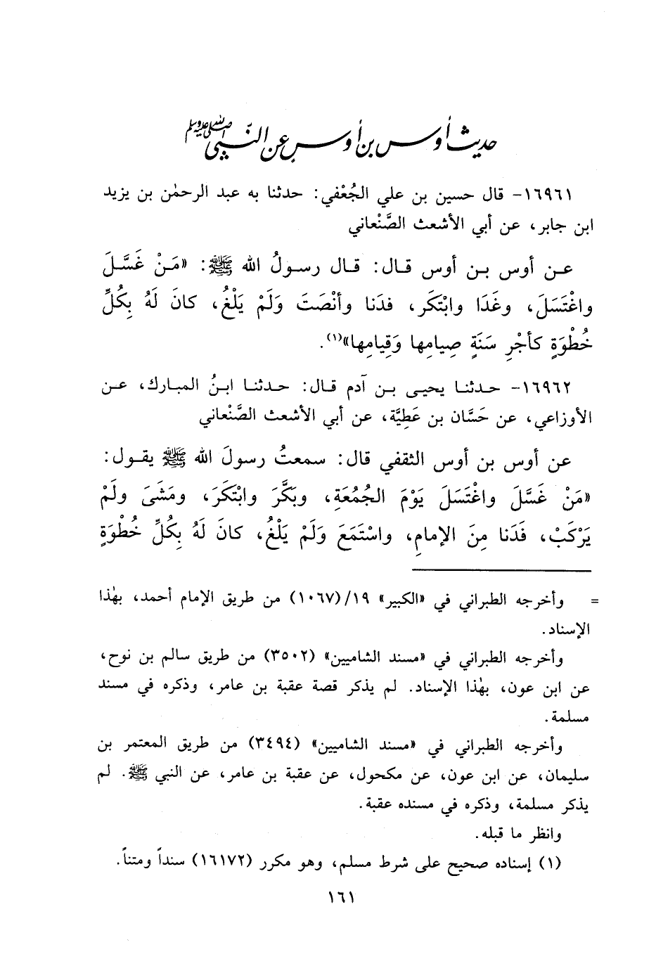 ١٦٩٦١ - قَالَ حُسَيْنُ بْنُ عَلِيٍّ الْجُعْفِيُّ: حَدَّثَنَا بِهِ عَبْدُ الرَّحْمَنِ بْنُ يَزِيدَ بْنِ جَابِرٍ، عَنْ أَبِي الْأَشْعَثِ الصَّنْعَانِيِّ، عَنْ أَوْسِ بْنِ أَوْسٍ، قَالَ: قَالَ رَسُولُ اللهِ صَلَّى اللهُ عَلَيْهِ وَسَلَّمَ: " مَنْ غَسَّلَ وَاغْتَسَلَ، وَغَدَا وَابْتَكَرَ، فَدَنَا وَأَنْصَتَ وَلَمْ يَلْغُ، كَانَ لَهُ بِكُلِّ خُطْوَةٍ كَأَجْرِ سَنَةٍ، صِيَامِهَا وَقِيَامِهَا " (١)