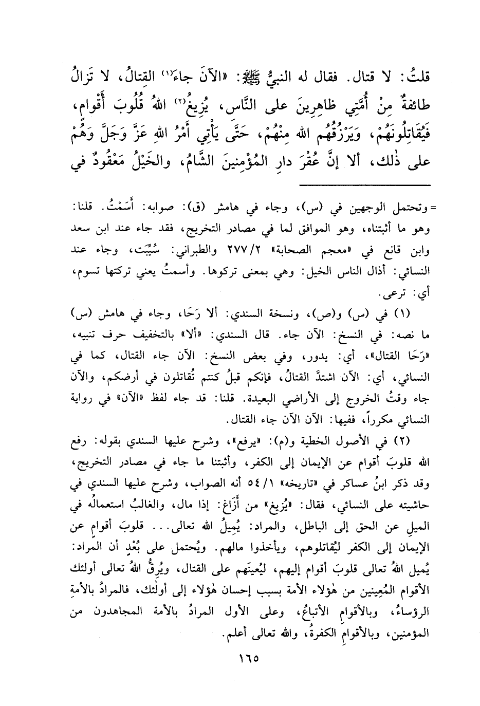 قُلْتُ: لَا قِتَالَ. فَقَالَ لَهُ النَّبِيُّ صَلَّى اللهُ عَلَيْهِ وَسَلَّمَ: " الْآنَ جَاءَ (١) الْقِتَالُ، لَا تَزَالُ طَائِفَةٌ مِنْ أُمَّتِي ظَاهِرِينَ عَلَى النَّاسِ، يَزْيِغُ (٢) اللهُ قُلُوبَ أَقْوَامٍ، فَيُقَاتِلُونَهُمْ، وَيَرْزُقُهُمُ اللهُ مِنْهُمْ، حَتَّى يَأْتِيَ أَمْرُ اللهِ عَزَّ وَجَلَّ وَهُمْ عَلَى ذَلِكَ، أَلَا إِنَّ عُقْرَ دَارِ الْمُؤْمِنِينَ الشَّامُ، وَالْخَيْلُ مَعْقُودٌ فِي