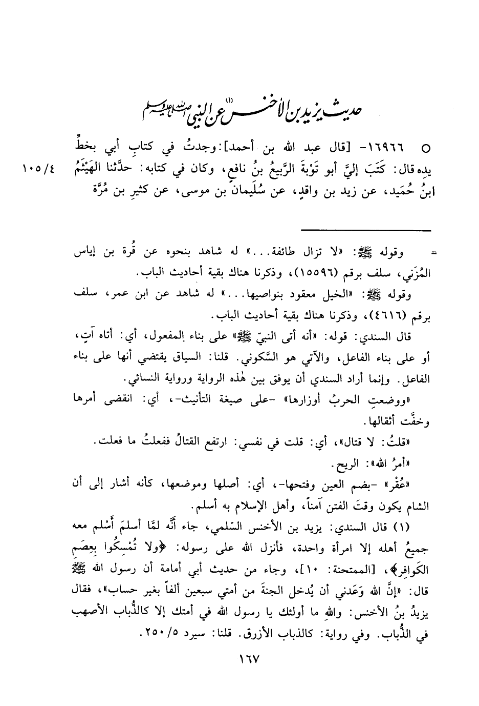 (١) قال السندي: يزيد بن الأخنس السّلمي، جاء أنَّه لمََّا أسلمَ أَسْلم معه جميعُ أهله إلا امرأة واحدة، فأنزل الله على رسوله: (ولا تُمْسِكُوا بِعِصَمِ الكَوافِر) ، [الممتحنة: ١٠] ، وجاء من حديث أبي أمامة أن رسول الله صَلَّى اللهُ عَلَيْهِ وَسَلَّمَ قال: "إنَّ الله وَعَدني أن يُدخل الجنةَ من أمتي سبعين ألفاً بغير حساب"، فقال يزيدُ بنُ الأخنس: واللهِ ما أولئك يا رسول الله في أمتك إلا كالذُّباب الأصهب في الذُّباب. وفي رواية: كالذباب الأزرق. قلنا: سيرد ٥/٢٥٠.