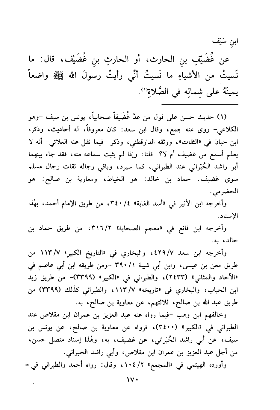 بْنِ سَيْفٍ، عَنْ غُضَيْفِ بْنِ الْحَارِثِ، أَوِ الْحَارِثِ بْنِ غُضَيْفٍ، قَالَ: مَا نَسِيتُ مِنَ الْأَشْيَاءِ مَا نَسِيتُ أَنِّي رَأَيْتُ رَسُولَ اللهِ صَلَّى اللهُ عَلَيْهِ وَسَلَّمَ " وَاضِعًا يَمِينَهُ عَلَى شِمَالِهِ فِي الصَّلَاةِ " (١)