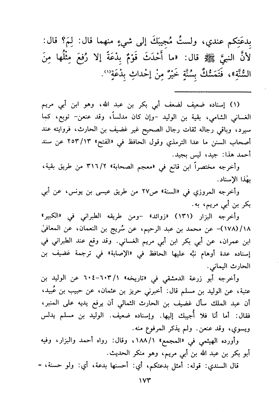 بِدْعَتِكُمْ عِنْدِي، وَلَسْتُ مُجِيبَكَ إِلَى شَيْءٍ مِنْهُمَا قَالَ: لِمَ؟ قَالَ: لِأَنَّ النَّبِيَّ صَلَّى اللهُ عَلَيْهِ وَسَلَّمَ قَالَ: " مَا أَحْدَثَ قَوْمٌ بِدْعَةً إِلَّا رُفِعَ مِثْلُهَا مِنَ السُّنَّةِ " فَتَمَسُّكٌ بِسُنَّةٍ خَيْرٌ مِنْ إِحْدَاثِ بِدْعَةٍ (١)