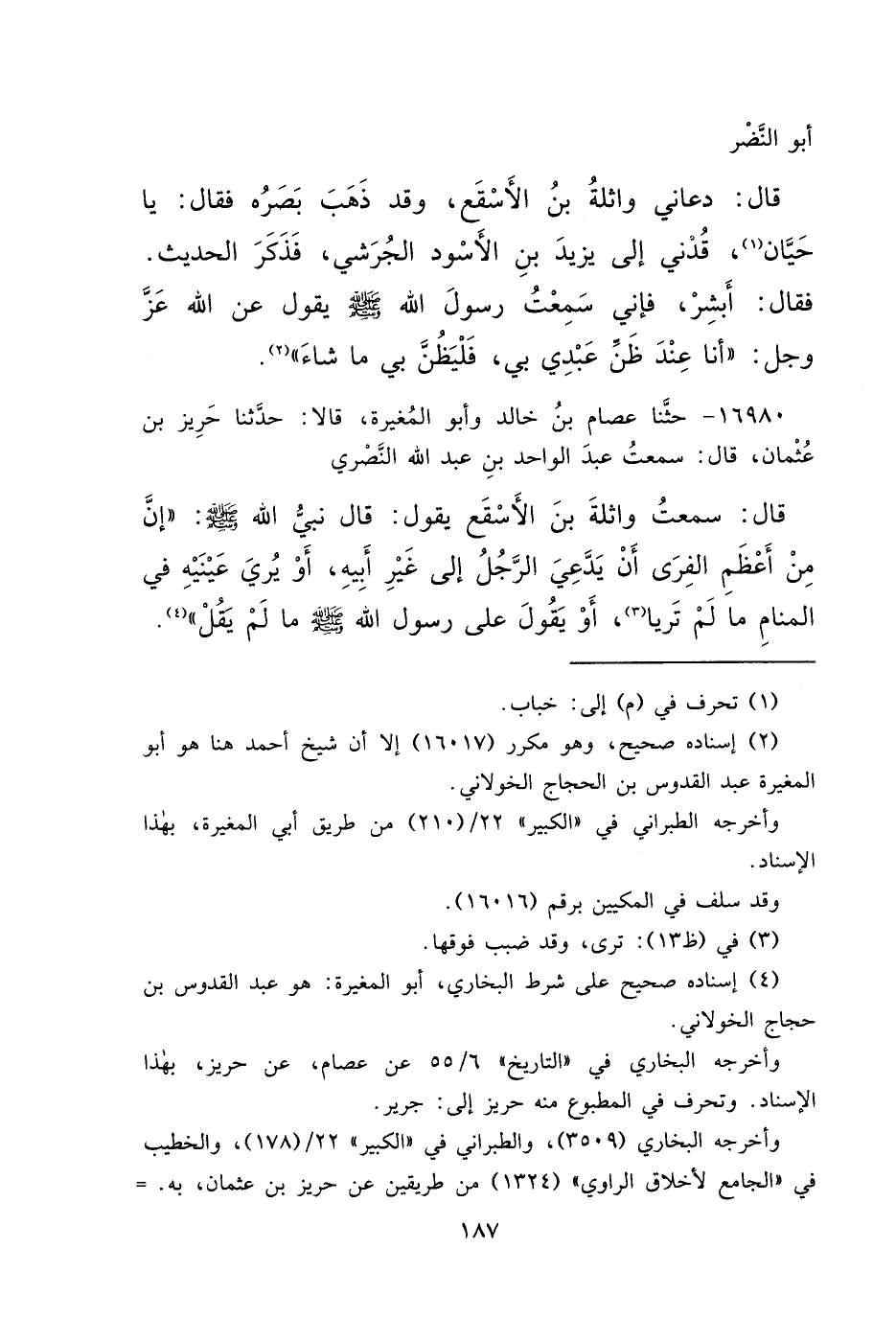 ١٦٩٨٠ - حَدَّثَنَا عِصَامُ بْنُ خَالِدٍ، وَأَبُو الْمُغِيرَةِ، قَالَا: حَدَّثَنَا حَرِيزُ بْنُ عُثْمَانَ، قَالَ: سَمِعْتُ عَبْدَ الْوَاحِدِ بْنَ عَبْدِ اللهِ النَّصْرِيَّ، قَالَ: سَمِعْتُ وَاثِلَةَ بْنَ الْأَسْقَعِ، يَقُولُ: قَالَ نَبِيُّ اللهِ صَلَّى اللهُ عَلَيْهِ وَسَلَّمَ: " إِنَّ مِنْ أَعْظَمِ الْفِرَى أَنْ يُدْعَى الرَّجُلُ إِلَى غَيْرِ أَبِيهِ، أَوْ يُرِيَ عَيْنَيْهِ فِي الْمَنَامِ مَا لَمْ تَرَيَا (٣) ، أَوْ يَقُولَ: عَلَى رَسُولِ اللهِ صَلَّى اللهُ عَلَيْهِ وَسَلَّمَ مَا لَمْ يَقُلْ " (٤)