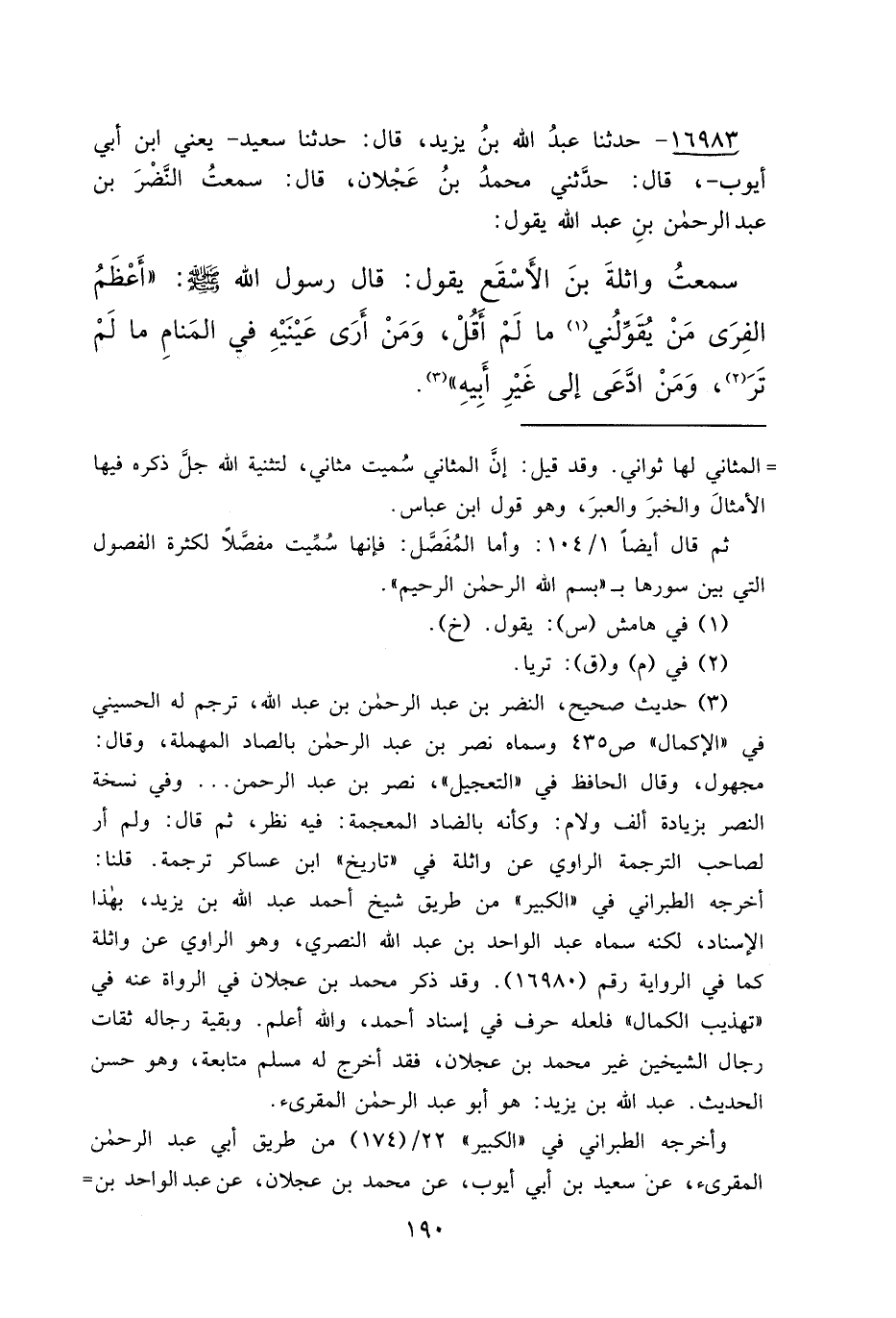 ١٦٩٨٣ - حَدَّثَنَا عَبْدُ اللهِ بْنُ يَزِيدَ، قَالَ: حَدَّثَنَا سَعِيدٌ يَعْنِي ابْنَ أَبِي أَيُّوبَ، قَالَ: حَدَّثَنِي مُحَمَّدُ بْنُ عَجْلَانَ، قَالَ: سَمِعْتُ النَّضْرُ بنُ عَبْدِ الرَّحْمَنِ بنِ عَبْدِ اللهِ، يَقُولُ: سَمِعْتُ وَاثِلَةَ بْنَ الْأَسْقَعِ، يَقُولُ: قَالَ رَسُولُ اللهِ صَلَّى اللهُ عَلَيْهِ وَسَلَّمَ: " أَعْظَمُ الْفِرَى مَنْ يُقَوِّلُنِي (١) مَا لَمْ أَقُلْ، وَمَنْ أَرَى عَيْنَيْهِ فِي الْمَنَامِ مَا لَمْ تَرَ (٢) ، وَمَنْ ادَّعَى إِلَى غَيْرِ أَبِيهِ " (٣)
