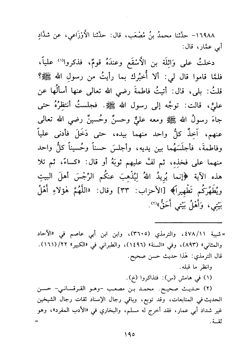 ١٦٩٨٨ - حَدَّثَنَا مُحَمَّدُ بْنُ مُصْعَبٍ، قَالَ: حَدَّثَنَا الْأَوْزَاعِيُّ، عَنْ شَدَّادٍ أَبِي عَمَّارٍ، قَالَ: دَخَلْتُ عَلَى وَاثِلَةَ بْنِ الْأَسْقَعِ، وَعِنْدَهُ قَوْمٌ، فَذَكَرُوا (١) عَلِيًّا، فَلَمَّا قَامُوا قَالَ لِي: أَلَا أُخْبِرُكَ بِمَا رَأَيْتُ مِنْ رَسُولِ اللهِ صَلَّى اللهُ عَلَيْهِ وَسَلَّمَ؟ قُلْتُ: بَلَى، قَالَ: أَتَيْتُ فَاطِمَةَ رَضِيَ اللهُ تَعَالَى عَنْهَا أَسْأَلُهَا عَنْ عَلِيٍّ، قَالَتْ: تَوَجَّهَ إِلَى رَسُولِ اللهِ صَلَّى اللهُ عَلَيْهِ وَسَلَّمَ. فَجَلَسْتُ أَنْتَظِرُهُ حَتَّى جَاءَ رَسُولُ اللهِ صَلَّى اللهُ عَلَيْهِ وَسَلَّمَ وَمَعَهُ عَلِيٌّ وَحَسَنٌ وَحُسَيْنٌ رَضِيَ اللهُ تَعَالَى عَنْهُمْ، آخِذٌ كُلَّ وَاحِدٍ مِنْهُمَا بِيَدِهِ، حَتَّى دَخَلَ فَأَدْنَى عَلِيًّا وَفَاطِمَةَ، فَأَجْلَسَهُمَا بَيْنَ يَدَيْهِ، وَأَجْلَسَ حَسَنًا، وَحُسَيْنًا كُلَّ وَاحِدٍ مِنْهُمَا عَلَى فَخِذِهِ، ثُمَّ لَفَّ عَلَيْهِمْ ثَوْبَهُ - أَوْ قَالَ: كِسَاءً - ثُمَّ تَلَا هَذِهِ الْآيَةَ: {إِنَّمَا يُرِيدُ اللهُ لِيُذْهِبَ عَنْكُمُ الرِّجْسَ أَهْلَ الْبَيْتِ وَيُطَهِّرَكُمْ تَطْهِيرًا} [الأحزاب: ٣٣] وَقَالَ: " اللهُمَّ هَؤُلَاءِ أَهْلُ بَيْتِي، وَأَهْلُ بَيْتِي أَحَقُّ " (٢)