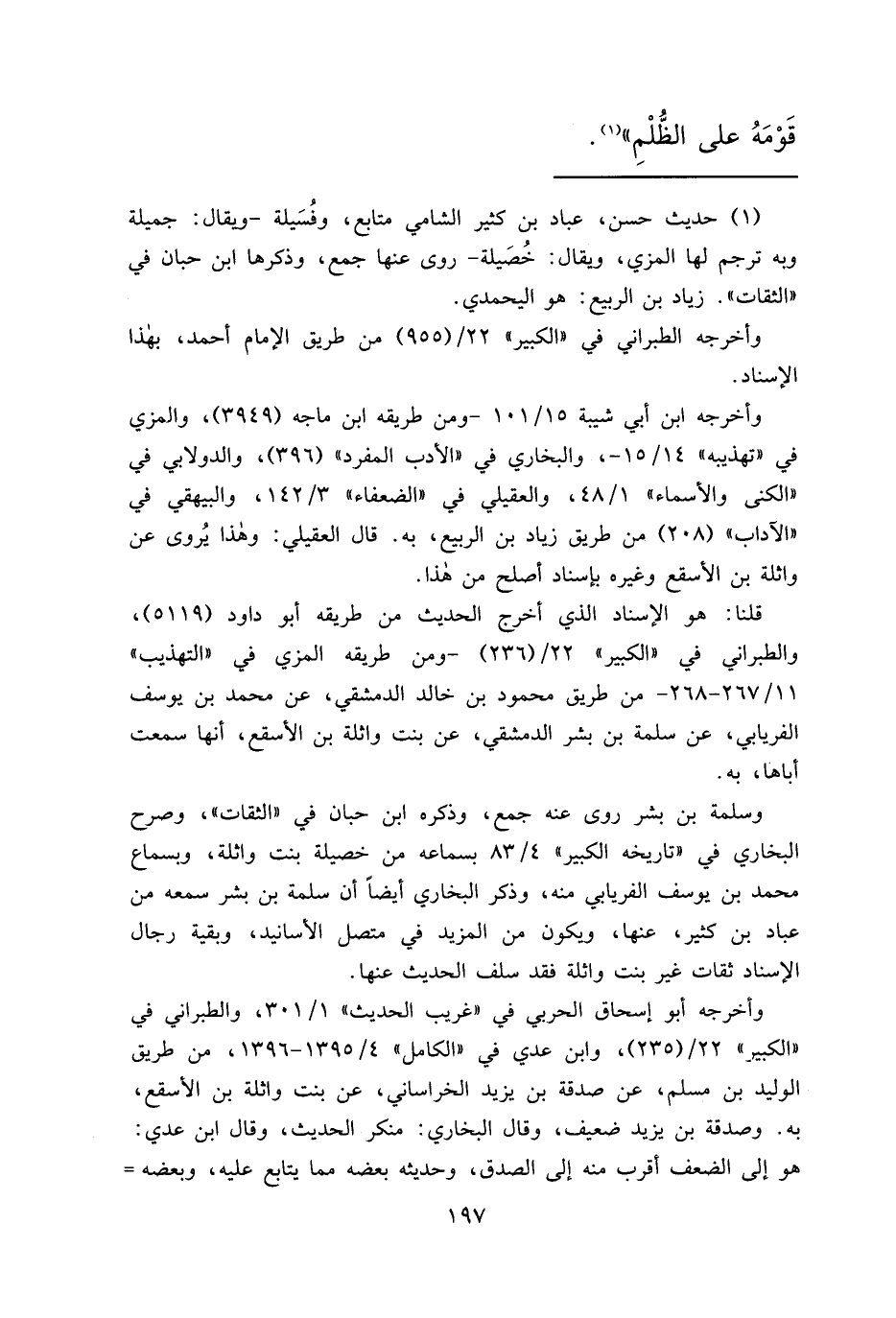 قلنا: هو الإسناد الذي أخرج الحديث من طريقه أبو داود (٥١١٩) ، والطبراني في "الكبير" ٢٢/ (٢٣٦) - ومن طريقه المزي في "التهذيب" ١١/٢٦٧- ٢٦٨- من طريق محمود بن خالد الدمشقي، عن محمد بن يوسف الفريابي، عن سلمة بن بشر الدمشقي، عن بنت واثلة بن الأسقع، أنها سمعت