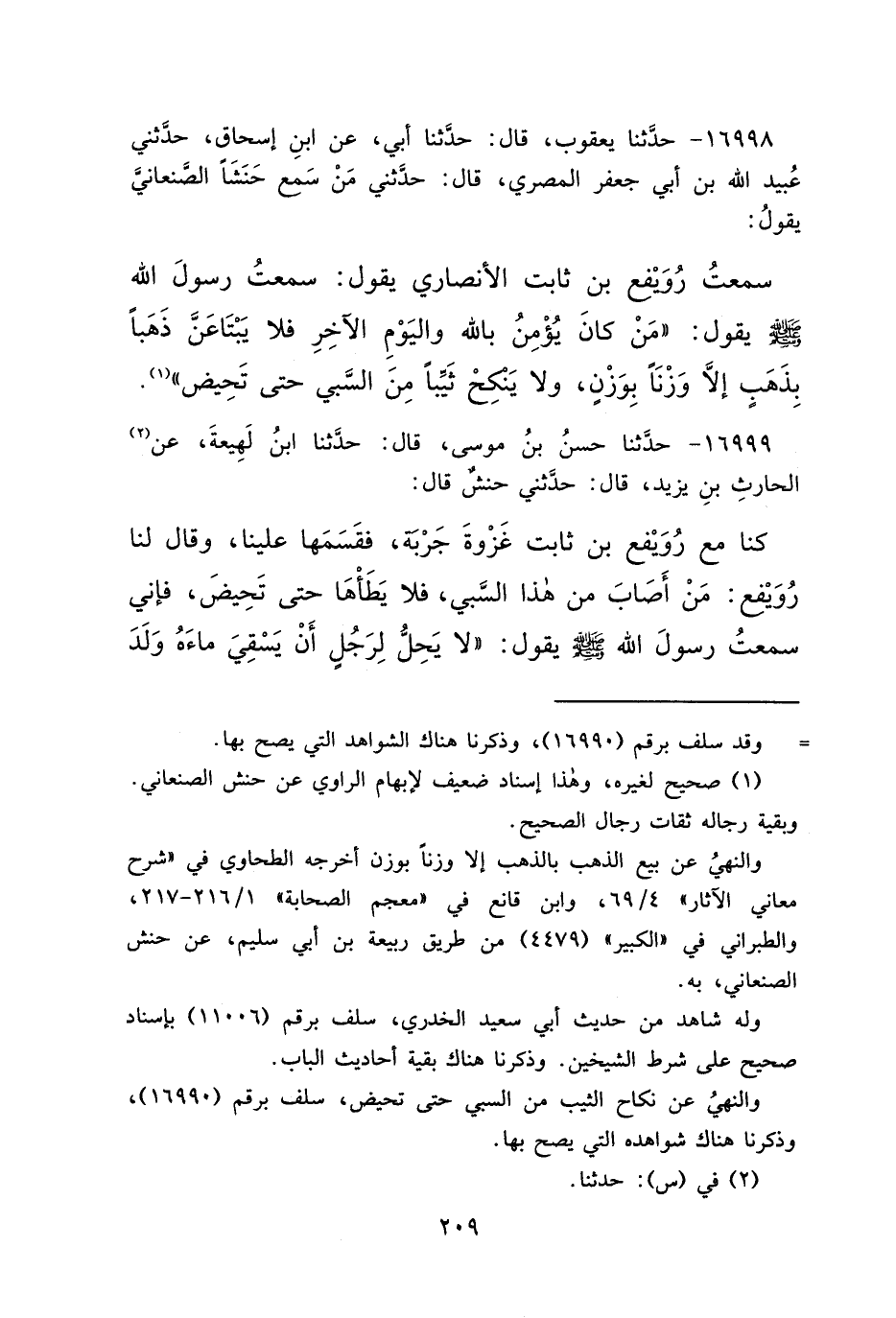 ١٦٩٩٨ - حَدَّثَنَا يَعْقُوبُ، قَالَ: حَدَّثَنَا أَبِي، عَنِ ابْنِ إِسْحَاقَ، حَدَّثَنِي عُبَيْدُ اللهِ بْنُ أَبِي جَعْفَرٍ الْمِصْرِيُّ، قَالَ: حَدَّثَنِي مَنْ، سَمِعَ حَنَشَاً الصَّنْعَانِيَّ، يَقُولُ: سَمِعْتُ رُوَيْفِعَ بْنَ ثَابِتٍ الْأَنْصَارِيَّ، يَقُولُ: سَمِعْتُ رَسُولَ اللهِ صَلَّى اللهُ عَلَيْهِ وَسَلَّمَ يَقُولُ: " مَنْ كَانَ يُؤْمِنُ بِاللهِ وَالْيَوْمِ الْآخِرِ فَلَا يَبْتَاعَنَّ ذَهَبًا بِذَهَبٍ إِلَّا وَزْنًا بِوَزْنٍ، وَلَا يَنْكِحُ ثَيِّبًا مِنَ السَّبْيِ حَتَّى تَحِيضَ " (١)