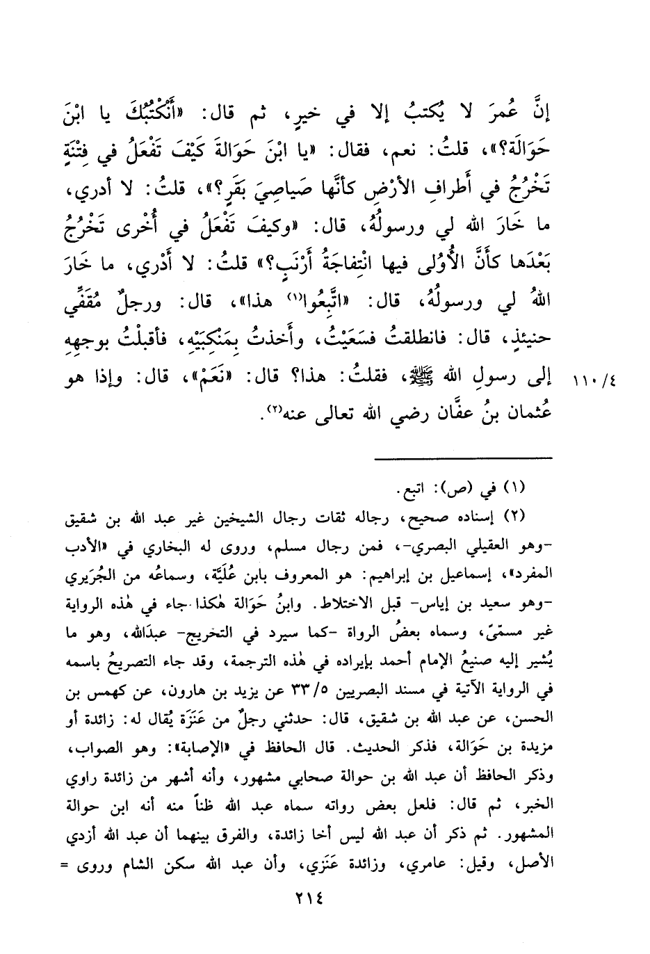إِنَّ عُمَرَ لَا يُكْتَبُ إِلَّا فِي خَيْرٍ، ثُمَّ قَالَ: " أَنَكْتُبُكَ يَا ابْنَ حَوَالَةَ؟ "، قُلْتُ: نَعَمْ، فَقَالَ: " يَا ابْنَ حَوَالَةَ كَيْفَ تَفْعَلُ فِي فِتْنَةٍ تَخْرُجُ فِي أَطْرَافِ الْأَرْضِ كَأَنَّهَا صَيَاصِي بَقَرٍ؟ "، قُلْتُ: لَا أَدْرِي، مَا خَارَ اللهُ لِي وَرَسُولُهُ، قَالَ: " وَكَيْفَ تَفْعَلُ فِي أُخْرَى تَخْرُجُ بَعْدَهَا كَأَنَّ الْأُولَى فِيهَا انْتِفَاجَةُ أَرْنَبٍ؟ " قُلْتُ: لَا أَدْرِي، مَا خَارَ اللهُ لِي وَرَسُولُهُ، قَالَ: " اتَّبِعُوا (١) هَذَا "، قَالَ: وَرَجُلٌ مُقَفّي حِينَئِذٍ، قَالَ: فَانْطَلَقْتُ فَسَعَيْتُ، وَأَخَذْتُ بِمَنْكِبَيْهِ، فَأَقْبَلْتُ بِوَجْهِهِ إِلَى رَسُولِ اللهِ صَلَّى اللهُ عَلَيْهِ وَسَلَّمَ، فَقُلْتُ: هَذَا؟ قَالَ: " نَعَمْ "، قَالَ: وَإِذَا هُوَ عُثْمَانُ بْنُ عَفَّانَ رَضِيَ اللهُ تَعَالَى عَنْهُ (٢)
