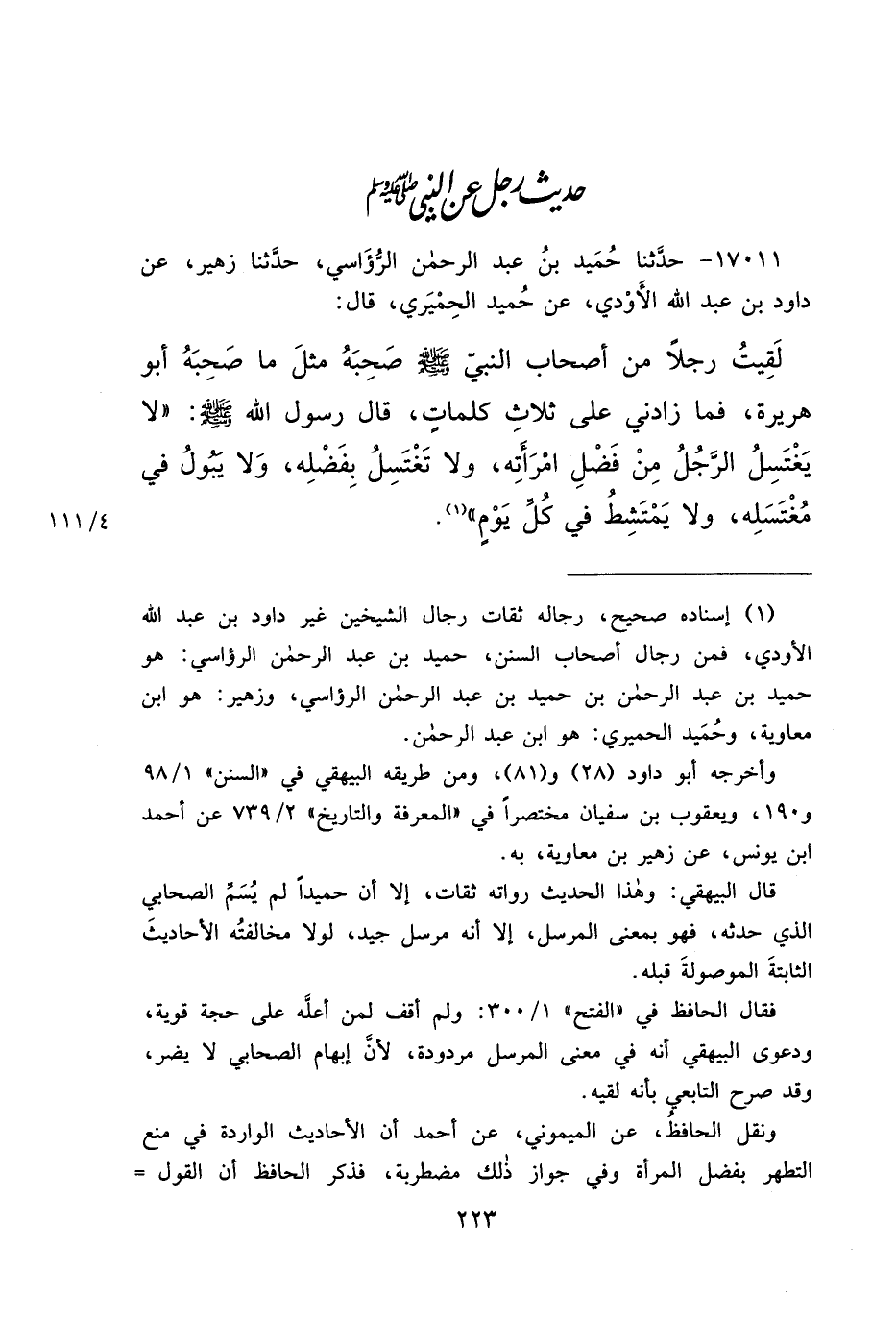 ١٧٠١١ - حَدَّثَنَا حُمَيْدُ بْنُ عَبْدِ الرَّحْمَنِ الرُّؤَاسِيُّ، حَدَّثَنَا زُهَيْرٌ، عَنْ دَاوُدَ بْنِ عَبْدِ اللهِ الْأَوْدِيِّ، عَنْ حُمَيْدٍ الْحِمْيَرِيِّ، قَالَ: لَقِيتُ رَجُلًا مِنْ أَصْحَابِ النَّبِيِّ صَلَّى اللهُ عَلَيْهِ وَسَلَّمَ صَحِبَهُ مِثْلَ مَا صَحِبَهُ أَبُو هُرَيْرَةَ، فَمَا زَادَنِي عَلَى ثَلَاثِ كَلِمَاتٍ، قَالَ رَسُولُ اللهِ صَلَّى اللهُ عَلَيْهِ وَسَلَّمَ: " لَا يَغْتَسِلُ الرَّجُلُ مِنْ فَضْلِ امْرَأَتِهِ، وَلَا تَغْتَسِلُ بِفَضْلِهِ، وَلَا يَبُولُ فِي مُغْتَسَلِهِ، وَلَا يَمْتَشِطُ فِي كُلِّ يَوْمٍ " (١)